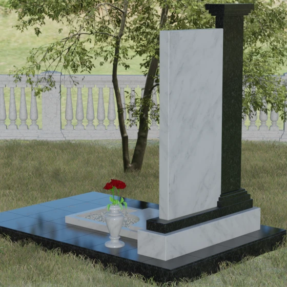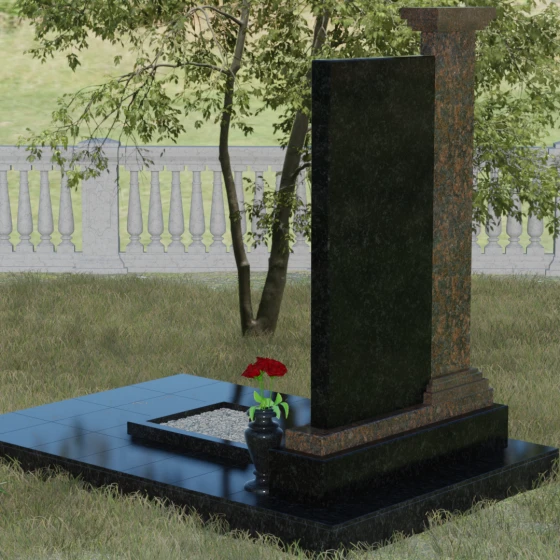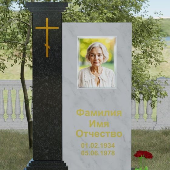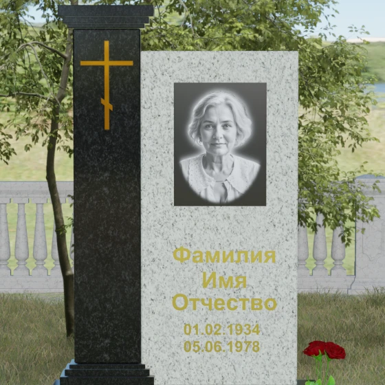 Композиция данного надгробия построена на гармоничном сочетании двух вертикальных элементов, установленных на массивное ступенчатое основание. Левая часть выполнена в виде величественной колонны с декоративным навершием в классическом стиле. На фронтальной стороне колонны расположена гравировка православного креста, покрытая сусальным золотом или имитирующим его составом, что придает мемориалу торжественный и одухотворенный вид. Правая часть — это лаконичная прямоугольная стела, предназначенная для размещения портрета и памятных надписей. Строгая геометрия линий подчеркивает внутреннюю силу и достоинство того, чья память здесь увековечена.