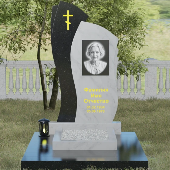 Данное ритуальное изделие представляет собой сложную художественную композицию, в которой мастерски обыгран контраст форм и материалов. В центре внимания — двухсоставная стела, объединяющая в себе мягкость восходящей линии и решительную геометрию скалы. Левый сегмент выполнен в виде изящной, тянущейся к небу волны из светлого камня, на которой лаконично расположился золоченый православный крест. Правая часть, служащая основанием для портрета, притягивает взгляд своей необычной обработкой: её внешний торец выполнен с каскадной, ступенчатой резкой, создающей эффект многослойности и глубины. Такая асимметрия символизирует сложность жизненного пути и возвышенность души.