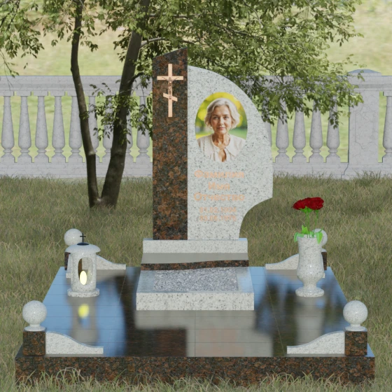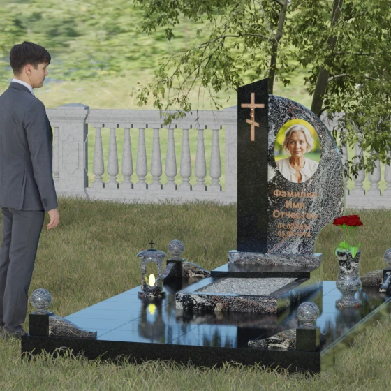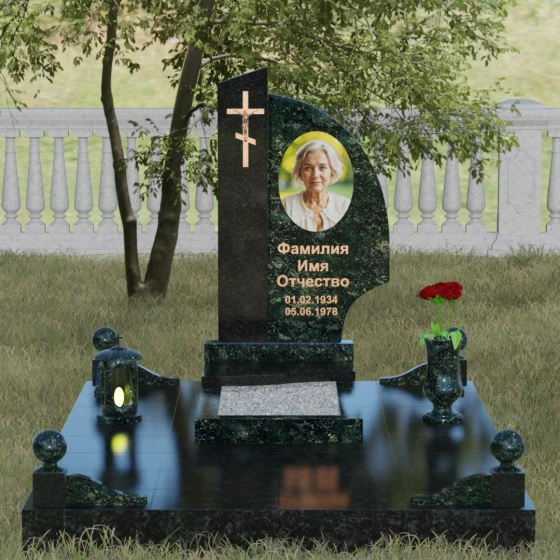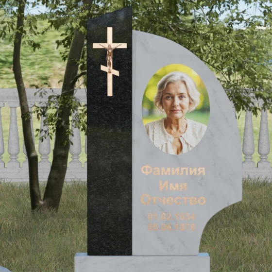 Оформление и советы искусствоведа: Для данной модели идеально подходит гравировка портрета в овальном или круглом формате, размещенная в верхней части «волнообразной» стелы. Это уравновешивает массивность левой части с крестом. Текст (ФИО и даты) рекомендуется выполнять глубоким академическим шрифтом с последующим покрытием сусальным золотом или «под бронзу», чтобы поддержать цветовую гамму распятия. Зеркальная полировка камня обеспечит четкость гравировки, которая не потускнеет и через сто лет, требуя лишь минимального ухода — протирки мягкой ветошью.