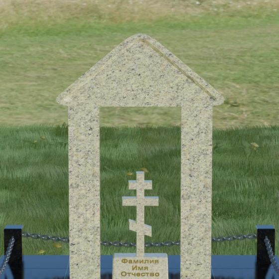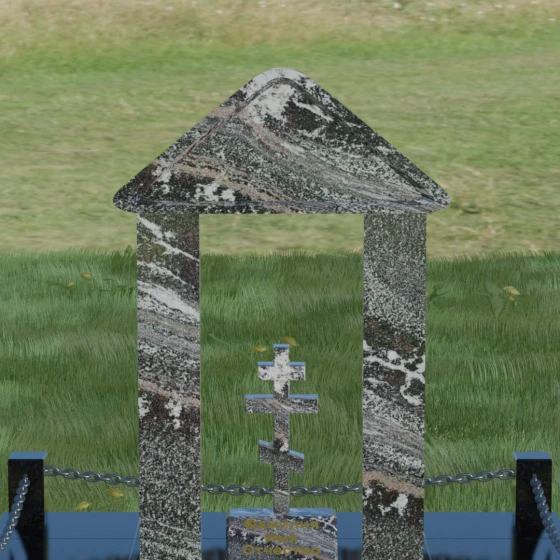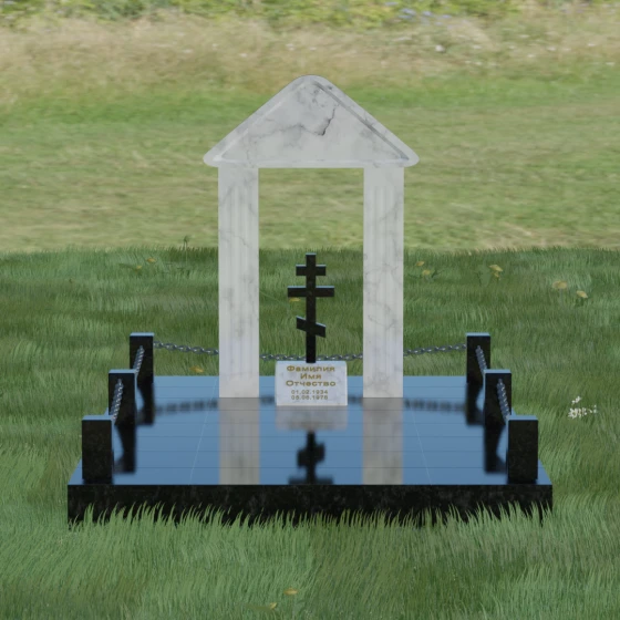 Модель №053 — это не просто памятник, а величественный мемориальный ансамбль, выполненный в лучших традициях храмового зодчества. Центральное место в композиции занимает надгробие из натурального камня, спроектированное в форме открытой арки или стилизованной часовни. Такая архитектурная форма символизирует небесные врата и покровительство высших сил. Внутри арочного свода, на отдельном постаменте, возвышается канонический православный восьмиконечный крест. Его строгие, безупречно выверенные пропорции подчеркивают глубокую веру и смирение, а объемная резьба придает элементу особую значимость. Массивное треугольное навершие (фронтон) венчает конструкцию, создавая ощущение завершенности и монументального спокойствия.