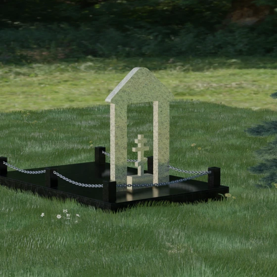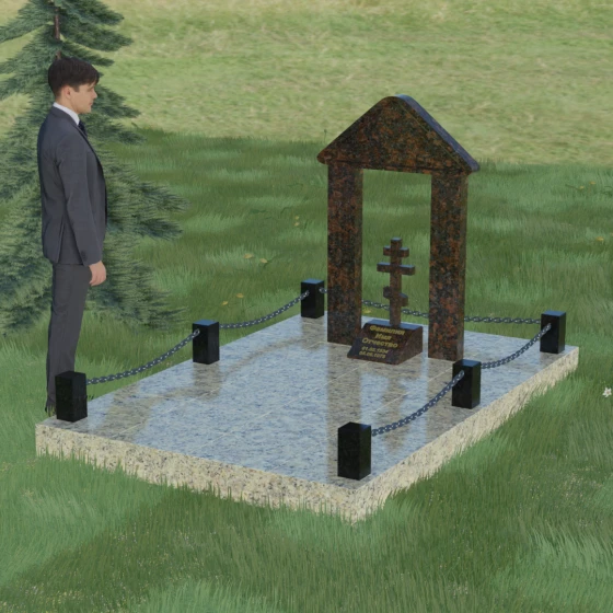 Эстетика данного комплекса строится на игре объемов и безупречной обработке каждой грани. Мастер-камнерез уделяет особое внимание полировке: зеркальный блеск основных плоскостей контрастирует с глубокими фасками и фальцами, которые подчеркивают геометрию арки. Благоустройство участка продумано до мелочей. Вся прилегающая территория закрыта сплошной полированной плитой, что не только придает мемориалу "дорогой" и законченный вид, но и гарантирует чистоту участка на десятилетия. Периметр обозначен строгими каменными столбиками, соединенными декоративными цепями, что создает четкую визуальную границу священного пространства и защищает его от внешних воздействий.
