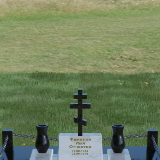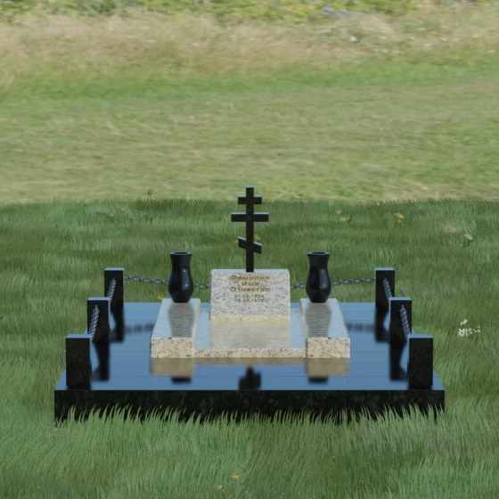 Особого внимания заслуживает художественная игра контрастов, реализованная в этой модели. Основная плита и декоративные элементы выполнены из глубокого черного камня с зеркальной полировкой, которая отражает окружающий мир, создавая эффект глубины. Стела имеет горизонтальную ориентацию, что позволяет разместить информацию максимально лаконично и читаемо. По обе стороны от центральной части расположены две изящные гранитные вазы, чьи плавные, точеные формы смягчают строгость прямых углов. Завершенность мемориальному комплексу придает массивное основание — надгробная плита, выполненная из гранита контрастного светлого оттенка. Такое решение не только эстетично, но и максимально практично: сплошное мощение участка полностью исключает рост сорной травы и необходимость сложного ухода за грунтом, сохраняя безупречный вид захоронения на десятилетия.