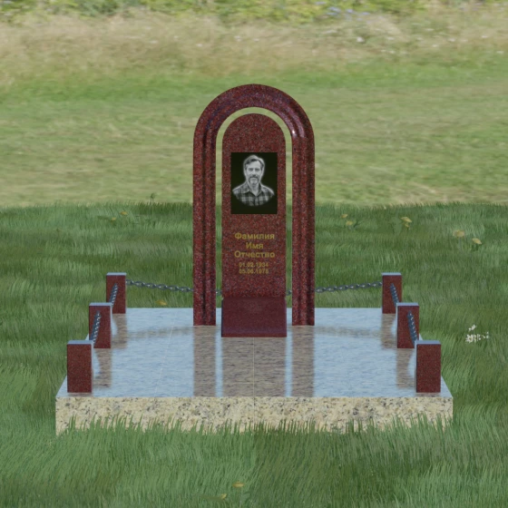 Эстетика этой модели строится на безупречной зеркальной полировке. Глубокий блеск камня отражает мир вокруг, визуально расширяя пространство и создавая игру света на изогнутых поверхностях. Особое внимание уделено благоустройству прилегающей территории: мемориал установлен на сплошную полированную плиту, полностью закрывающую участок. Это не только создает законченный и «дорогой» вид всей композиции, но и несет практическую пользу, исключая прорастание сорной травы и упрощая уход за местом памяти. По периметру установлены строгие квадратные столбики из натурального камня, соединенные массивными декоративными цепями. Такая ограда обозначает границы сакрального пространства, подчеркивая его обособленность и неприкосновенность, при этом не создавая ощущения тяжелой замкнутости.
