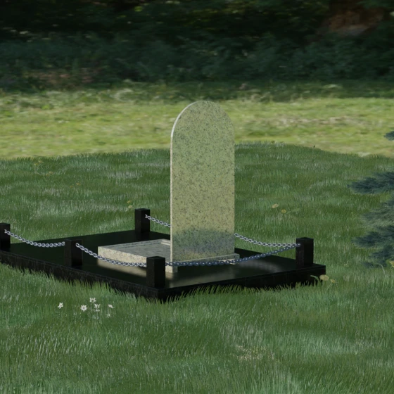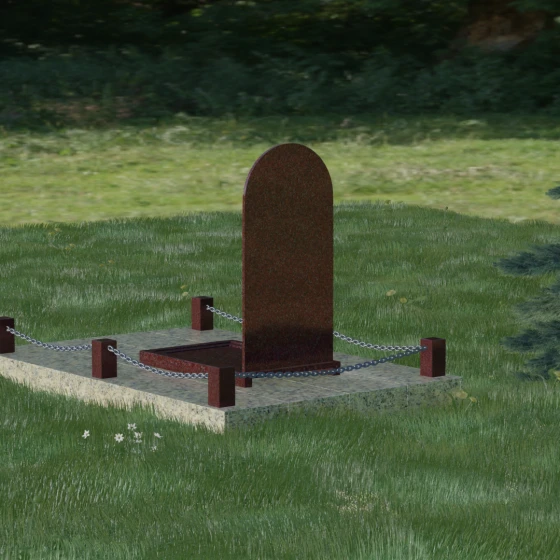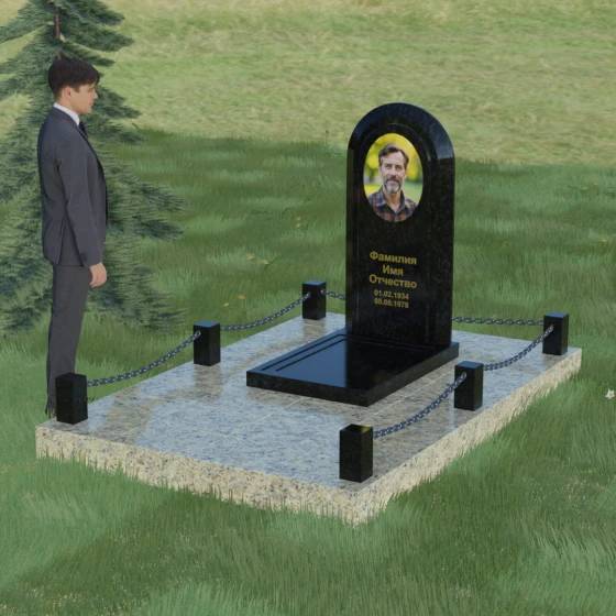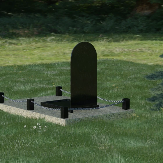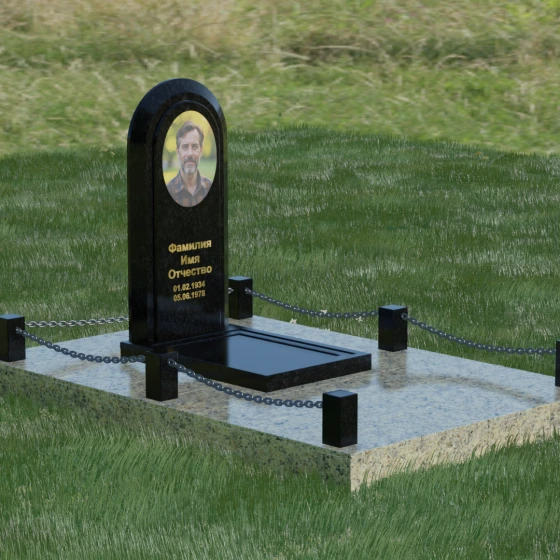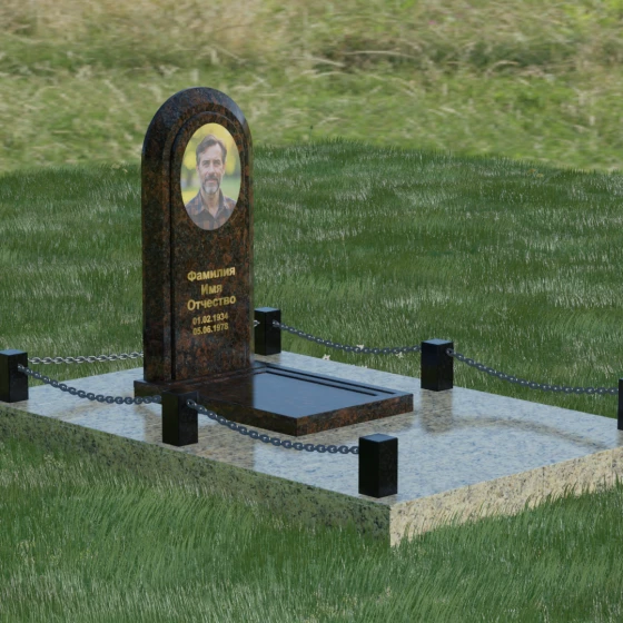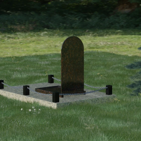 Комплексное решение по благоустройству участка, представленное на фото, превращает место захоронения в законченный архитектурный ансамбль. Установка монумента на массивный постамент и полное мощение участка гранитными плитами в цвет стелы исключает прорастание сорной травы и скопление грязи, обеспечивая всегда опрятный и ухоженный вид. Периметр участка выделен эстетичным цоколем с невысокими каменными столбиками, соединенными декоративными цепями. Эти элементы создают ощущение уединения и защищенности, подчеркивая границы сакрального пространства.
