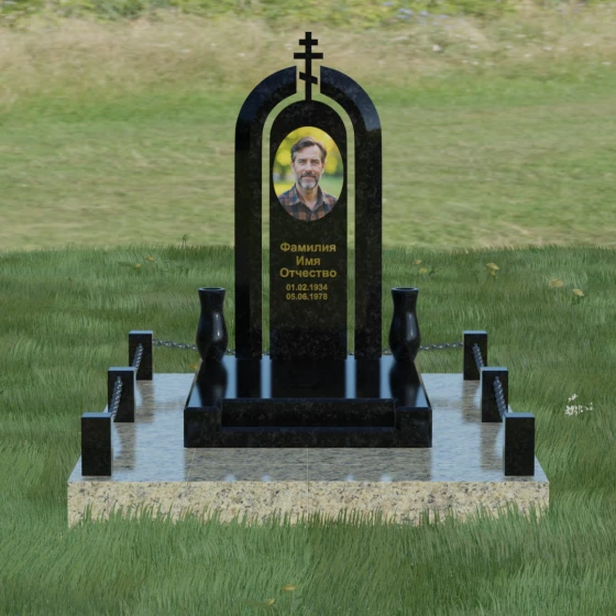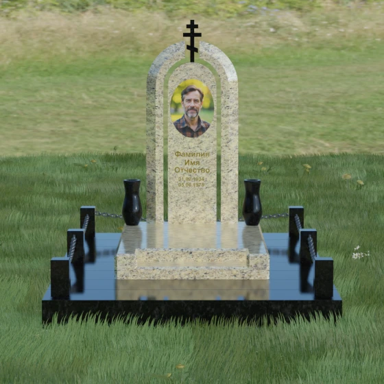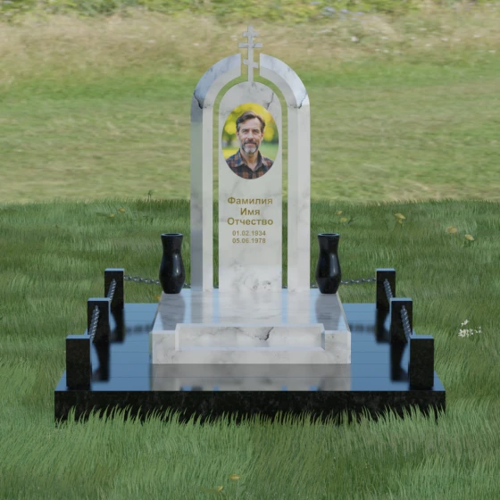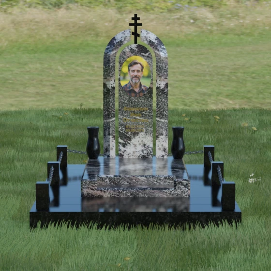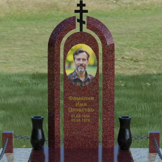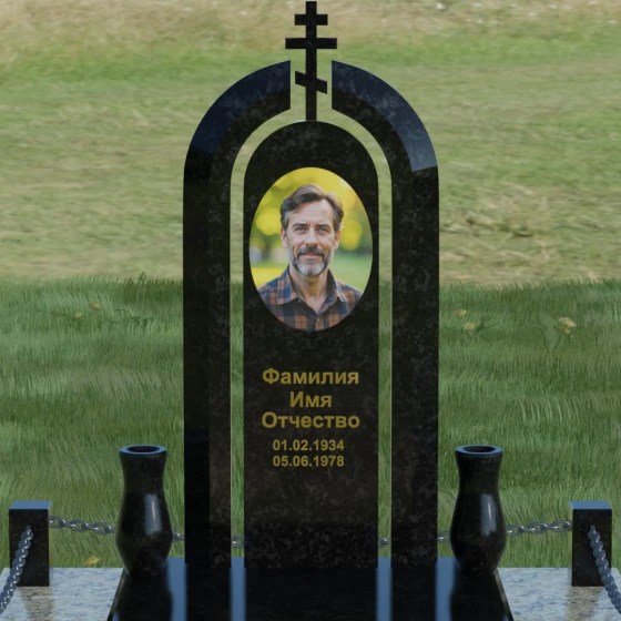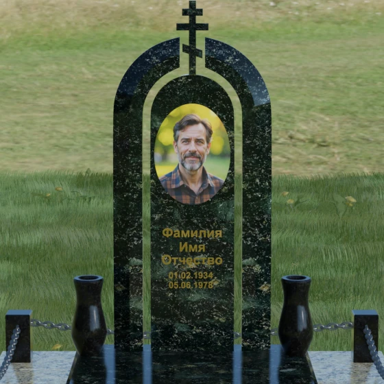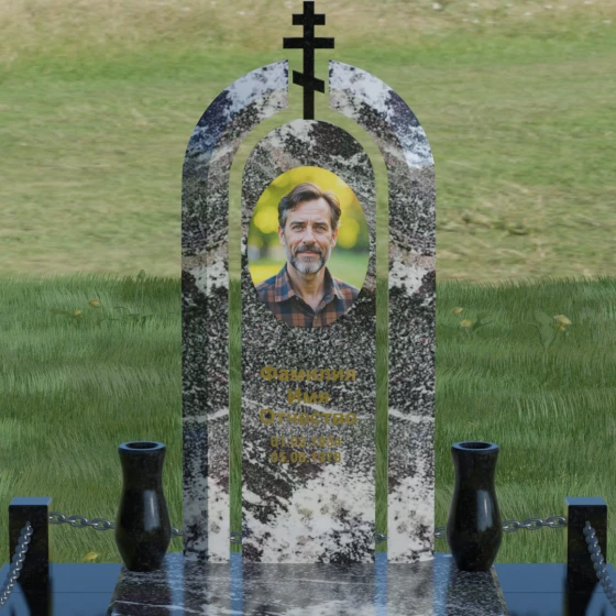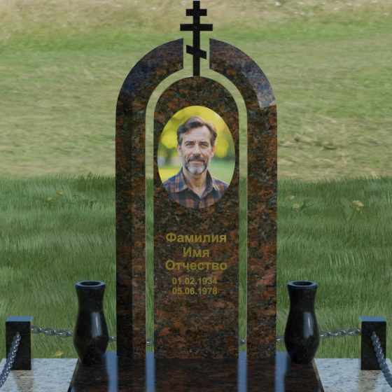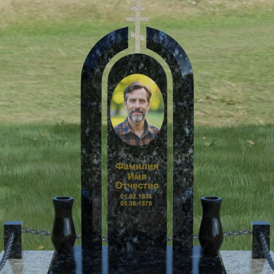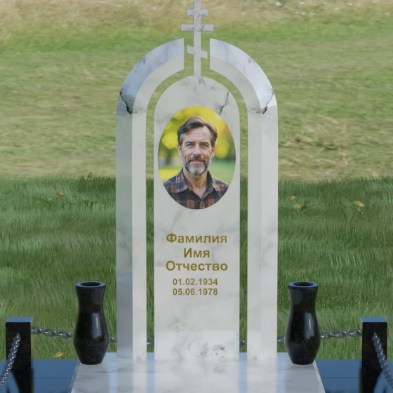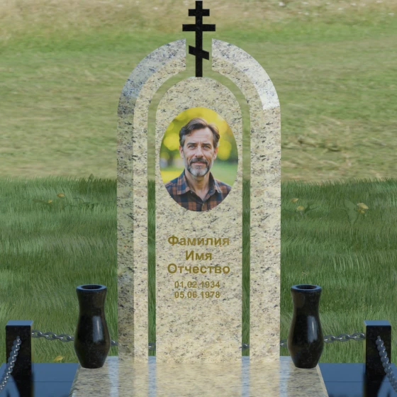 Выбор мемориала — это всегда поиск баланса между строгостью и изяществом, между земным почтением и духовным смыслом. Данная величественная стела представляет собой сложную архитектурную композицию, вдохновленную классическими канонами. В центре внимания находится тройная арочная конструкция: плавные, стремящиеся ввысь линии создают эффект легкости и божественного света, несмотря на внушительный вес натурального камня. Центральный элемент увенчан лаконичным православным крестом, выполненным из темного полированного гранита. Его строгая геометрия идеально завершает силуэт, превращая памятник в подобие священных врат или портала в вечность.