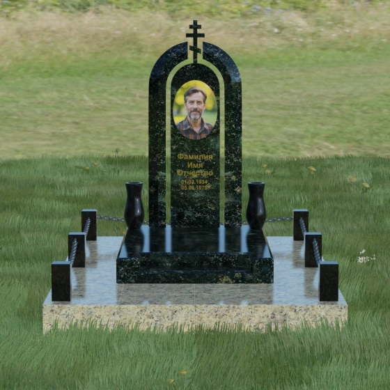 Центральная арка идеально подходит для размещения портрета — будь то классическая гравировка, цветная фотокерамика или современная печать на стекле. Золотистое тиснение букв на фоне темного камня смотрится особенно выразительно, обеспечивая отличную читаемость текста на многие годы. Мы понимаем, насколько важно сохранить память в деталях, поэтому уделяем внимание каждому миллиметру обработки.