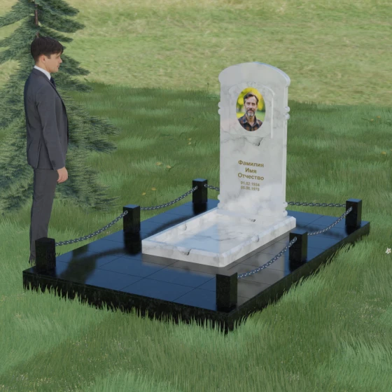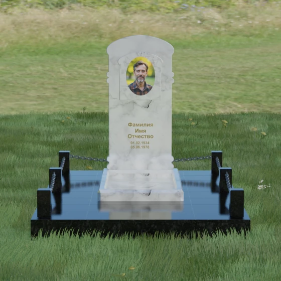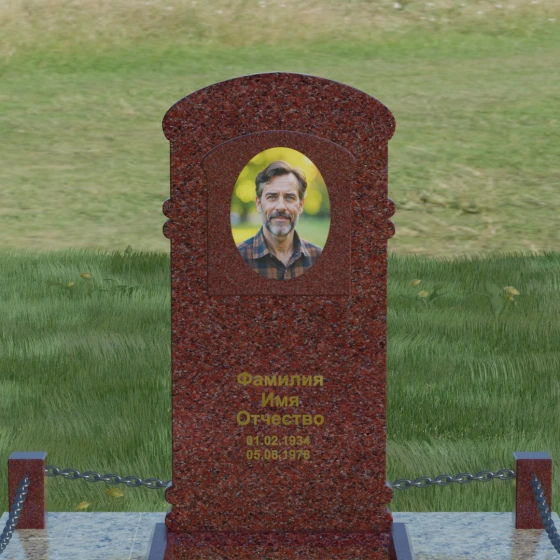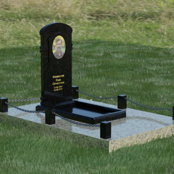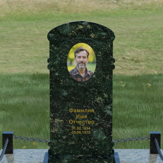 Представленная мемориальная композиция — это воплощение архитектурного баланса, где строгость классических форм встречается с мягкостью художественных линий. В центре ансамбля находится вертикальная стела с уникальной геометрией: её верхняя грань образует пологую, торжественную арку, которая плавно переходит в декоративные выступы на боковых гранях. Особенностью модели является глубокая резная ниша в форме идеального овала, создающая естественное обрамление для портрета. Внутренняя дуга, вырезанная в теле камня над портретной зоной, имитирует свод священной арки, придавая изделию объем и глубину. Зеркальная полировка основной плоскости создает глубокий, почти мистический блеск, в котором отражается небо, подчеркивая монументальность и чистоту исполнения каждой детали.