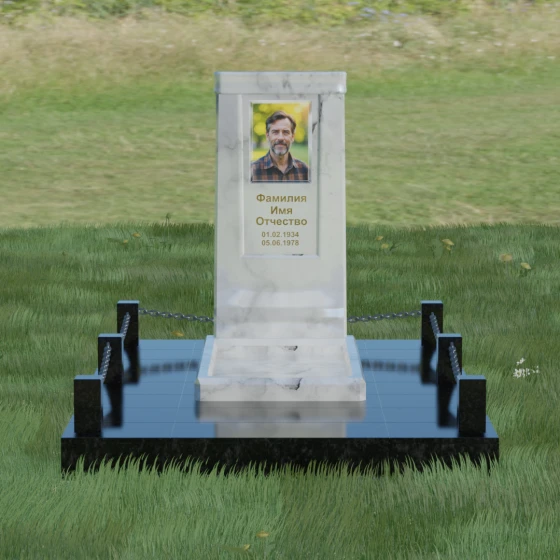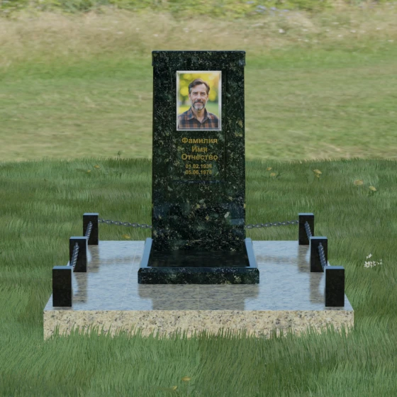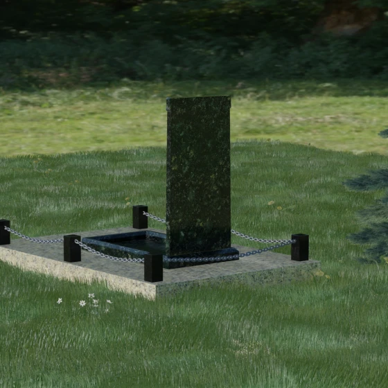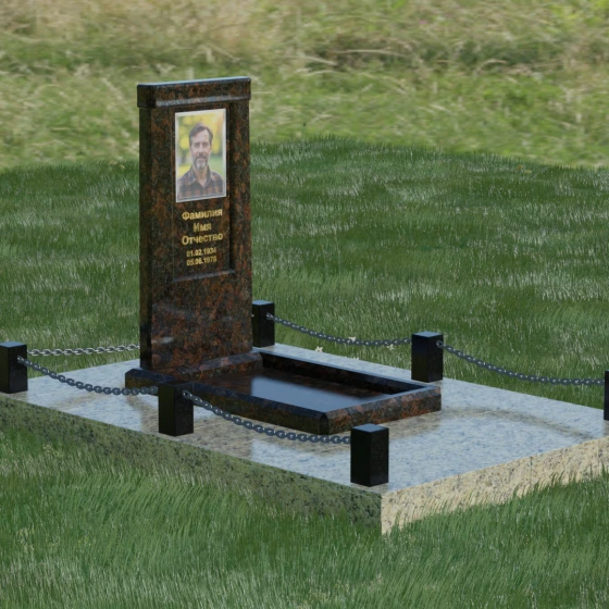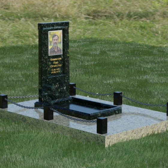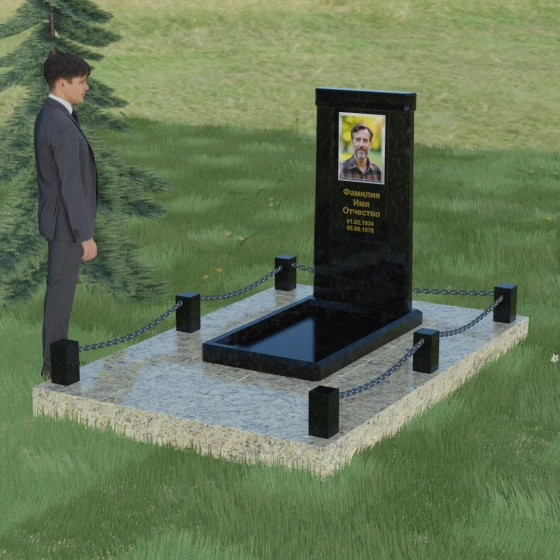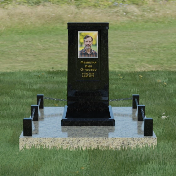 Особое внимание уделено благоустройству прилегающей территории. Монумент устанавливается на прочный гранитный цоколь, который служит надежным фундаментом и предотвращает перекос конструкции со временем. Участок полностью облицован массивными плитами из натурального камня в едином стиле с основным изделием. Такое решение не только придает захоронению законченный и опрятный вид, но и значительно упрощает уход за ним, исключая прорастание сорной травы. Периметр композиции обозначен строгими гранитными столбиками, соединенными декоративными цепями. Эти элементы создают визуальную границу уединения и покоя, превращая место памяти в достойный архитектурный ансамбль. Внутренняя ниша стелы идеально подходит для размещения широкоформатной фотокерамики или гравировки, дополненной покрытием сусальным золотом, что особенно эффектно смотрится на темных сортах камня.