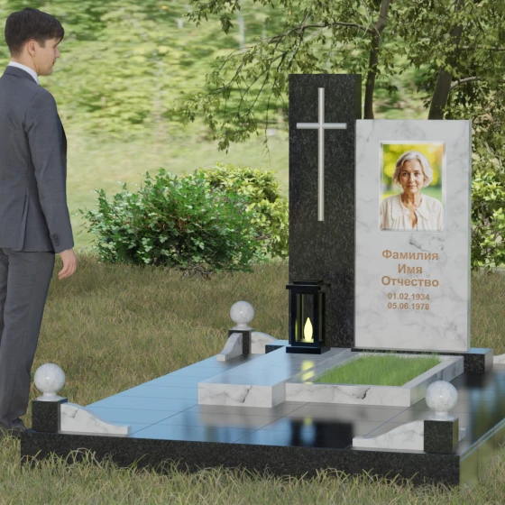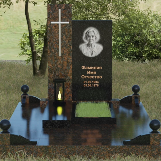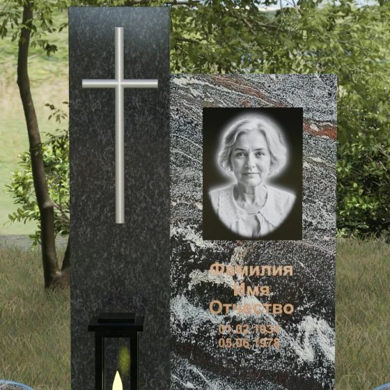 Центральным элементом выступает вертикальная стела, состоящая из двух контрастных блоков, символизирующих дуальность бытия. Левая часть композиции выполнена в виде высокого узкого пилона из насыщенного цветного гранита. На его фронтальной стороне закреплен лаконичный четырехконечный крест с благородным металлическим напылением. Отсутствие лишнего декора на кресте подчеркивает торжественность и строгость момента. Правое крыло стелы — более широкое и основательное — служит идеальным полотном для нанесения портрета и эпитафии. Контраст между глубоким темным оттенком основной плиты и ярким акцентом левой части создает динамику, притягивающую взгляд, но сохраняющую общее настроение светлой грусти.