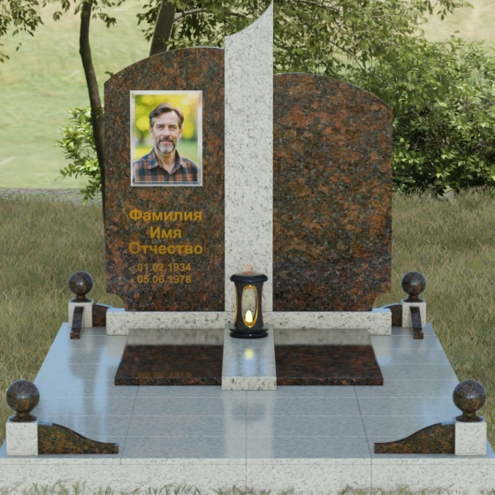 Гранитный монумент артикула 068 представляет собой гармоничную архитектурную композицию, которая выделяется на фоне традиционных решений своей благородной асимметрией и сложной игрой фактур. В основе дизайна лежит сочетание двух контрастных видов камня, разделенных изящной вертикальной вставкой. Основные элементы мемориала имеют мягкие, дугообразные завершения, напоминающие своды храма или спокойные изгибы горизонта. Такое решение лишает памятник излишней суровости, привнося в облик места захоронения чувство умиротворения и светлой печали. Особое внимание привлекает центральный декоративный элемент: узкая колонна из текстурного гранита с рваной или полированной поверхностью служит смысловым акцентом, соединяющим две части надгробия в единый ансамбль.