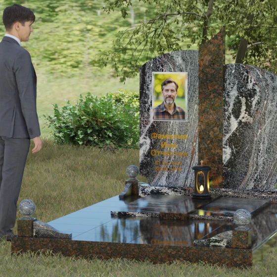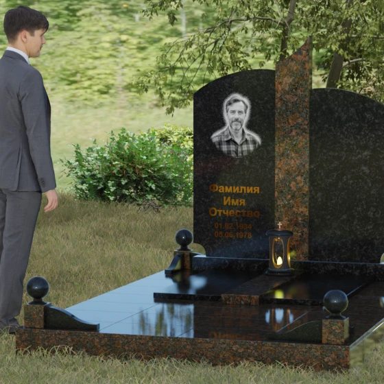 На широкой левой части композиции идеально располагается гравированный портрет или фотокерамическое панно. Темный фон основного камня обеспечивает максимальную контрастность для золоченой надписи, делая каждое слово четким и легко читаемым. Мы понимаем, как важно передать теплоту ваших чувств, поэтому наши мастера помогут подобрать шрифт и размер элементов оформления так, чтобы они гармонировали с величественной геометрией камня. Пусть этот мемориал станет достойным символом вашей любви и преданности, сохраняя историю жизни для будущих поколений.