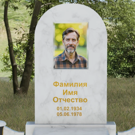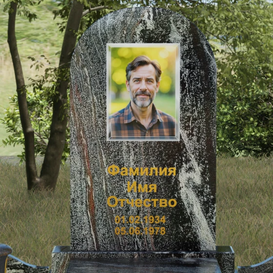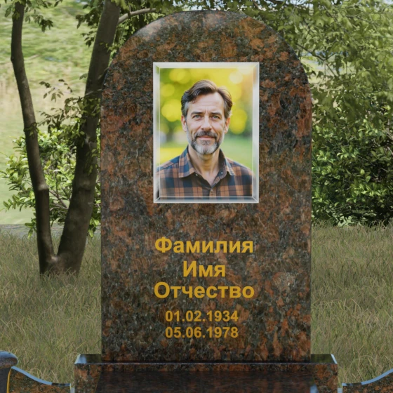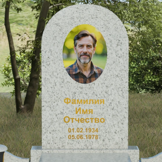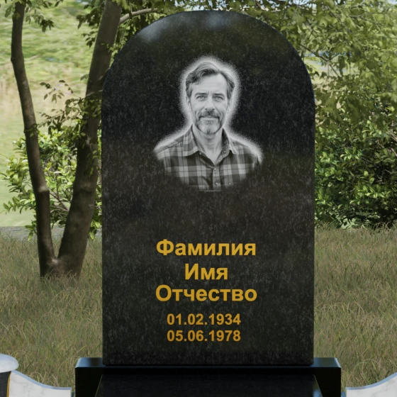 Геометрия арочного свода идеально подходит для центрированного расположения портрета. Будь то классическая лазерная гравировка с высокой детализацией или современный фотокерамический медальон, форма арки естественным образом обрамляет лик, концентрируя на нем внимание. Просторная поверхность позволяет гармонично разместить не только фамилию и даты, но и эпитафию или дополнительные художественные элементы. На представленных образцах мы видим, как эффектно смотрится золочение букв на темном фоне, добавляя мемориалу торжественности и статусности.