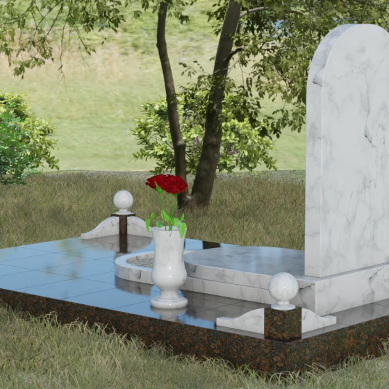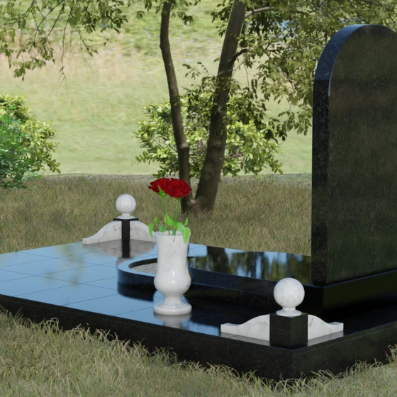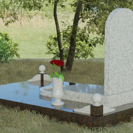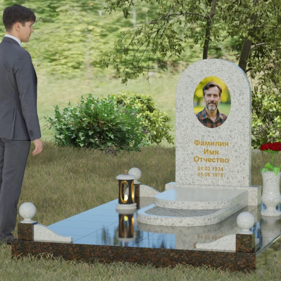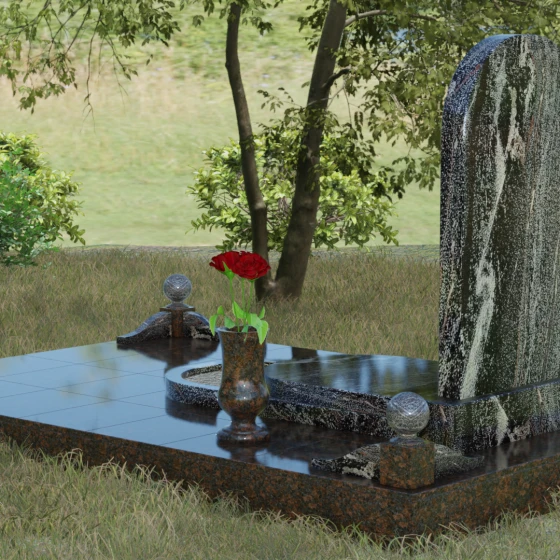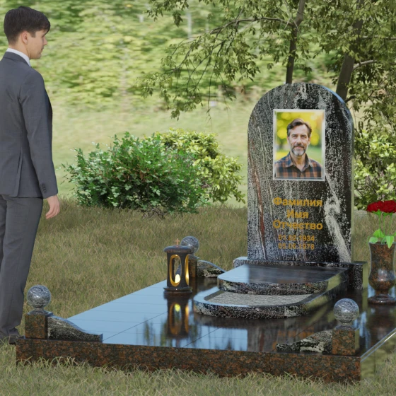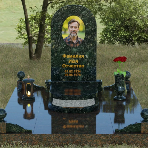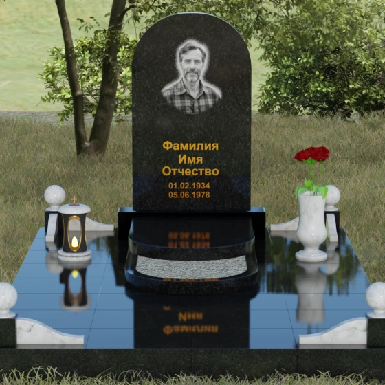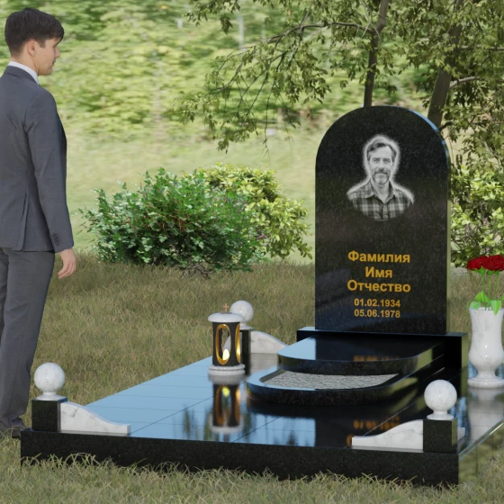 Особое внимание привлекает игра фактур и объемов. Зеркальная полировка центрального обелиска создает эффект глубины, в которой отражается окружающее пространство, делая памятник живым и изменчивым. Благоустройство участка выполнено по европейскому стандарту: вся территория мемориала вымощена строгой гранитной плиткой, что не только придает эстетическую завершенность, но и гарантирует безупречный вид участка на десятилетия, избавляя от необходимости борьбы с сорняками. Периметр обозначен элегантным цоколем с акцентными столбиками, увенчанными идеальными каменными сферами. Эти шары расставляют четкие визуальные акценты, превращая место захоронения в полноценный архитектурный объект.
