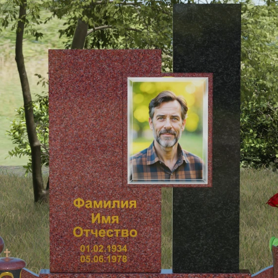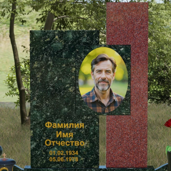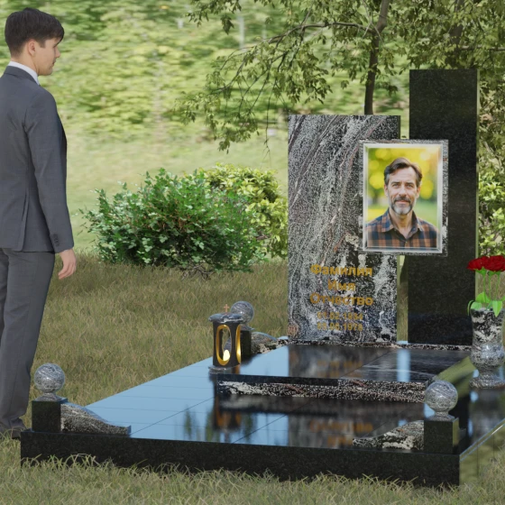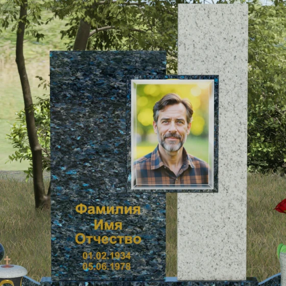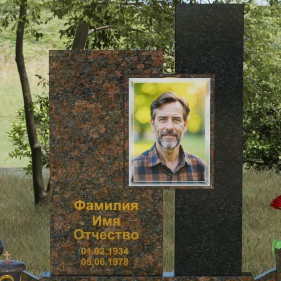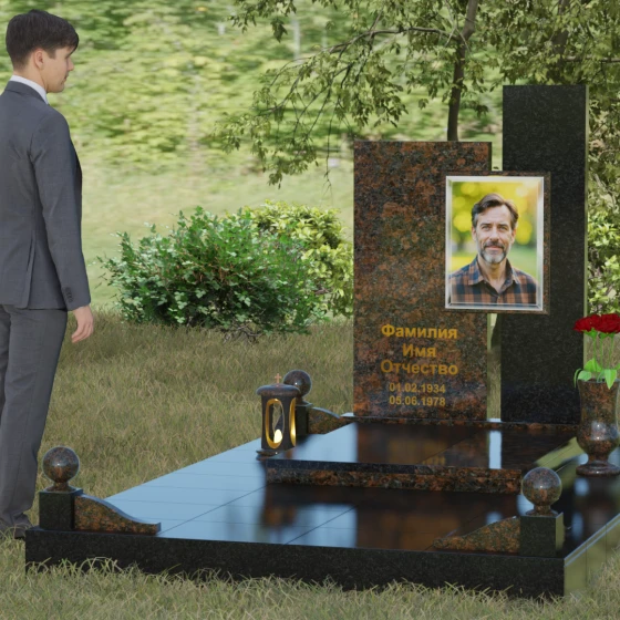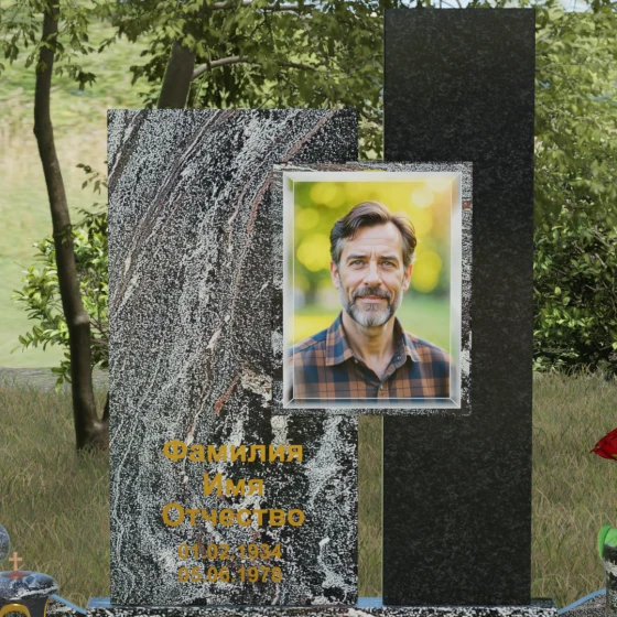 Советы по оформлению: Для данной геометрической формы мы рекомендуем использовать гравировку ФИО и дат с покрытием «сусальное золото» или глубокий пескоструйный метод. Это создаст необходимый контраст с темной поверхностью камня и подчеркнет статусность мемориала. Портрет на отдельной выступающей плите лучше всего выполнять в технике классической гравировки или на керамике большого формата, чтобы он стал визуальным центром всей экспозиции.