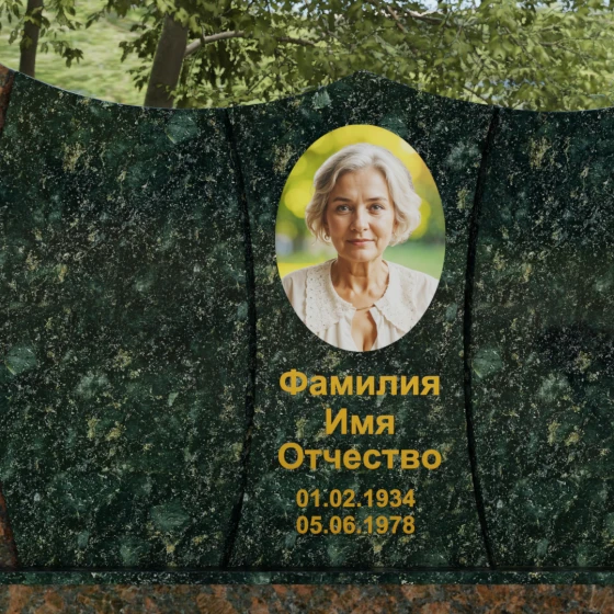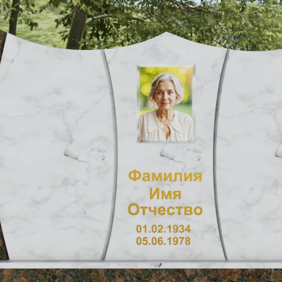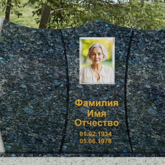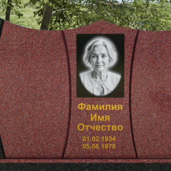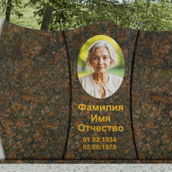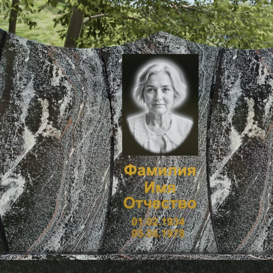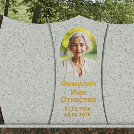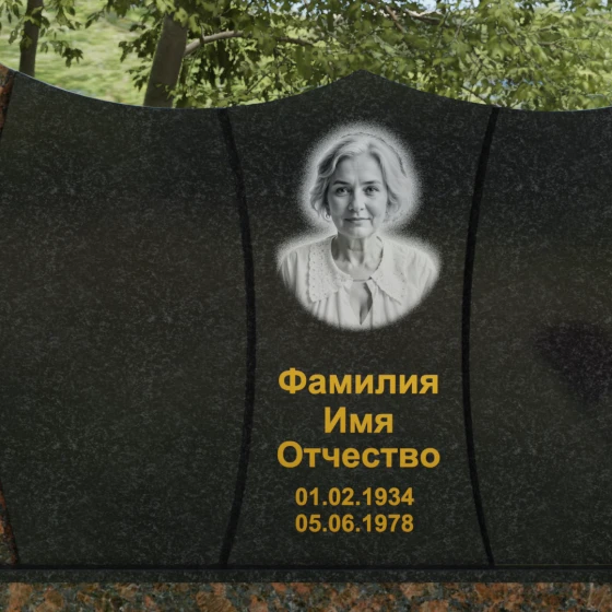 Оформление: Для данной модели идеально подходит гравировка букв с последующим покрытием сусальным золотом или «антиком». Это создает великолепный контраст с темными видами гранита. Портрет может быть выполнен как в виде классической гравировки, так и на широкоформатной керамике, которая интегрируется в нишу стелы, создавая единую плоскость с камнем.