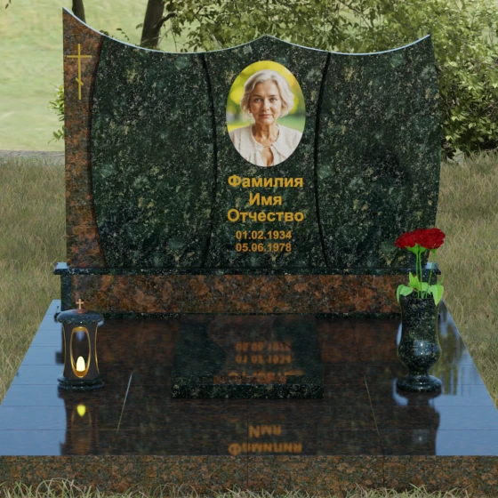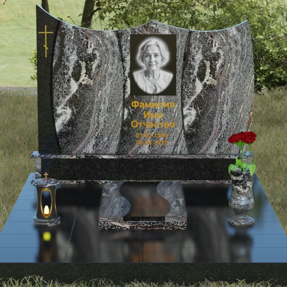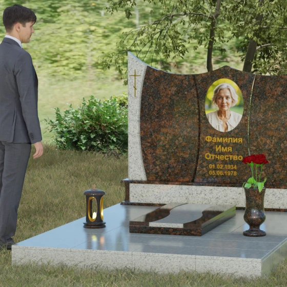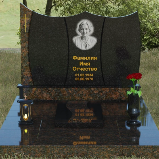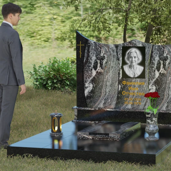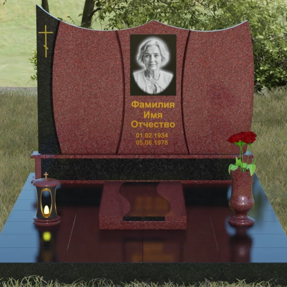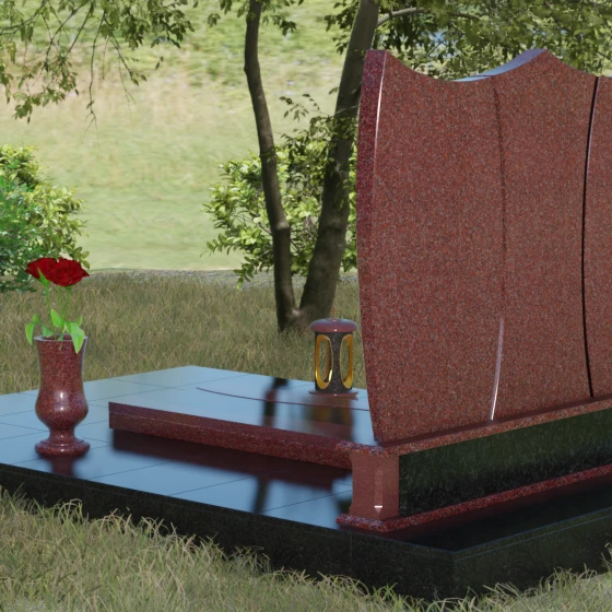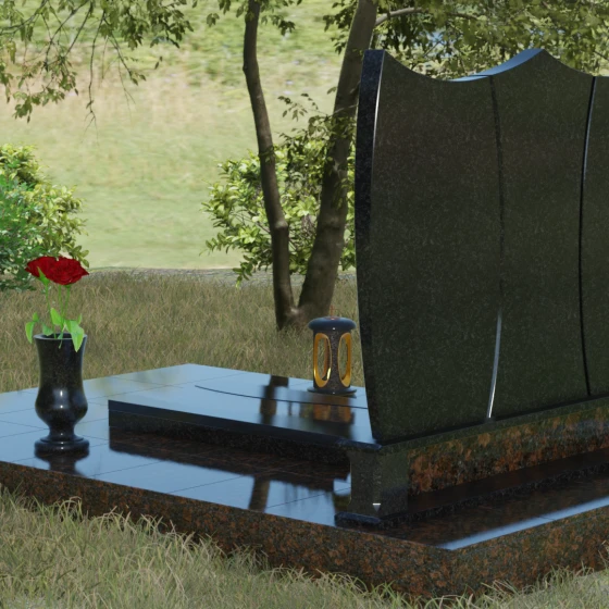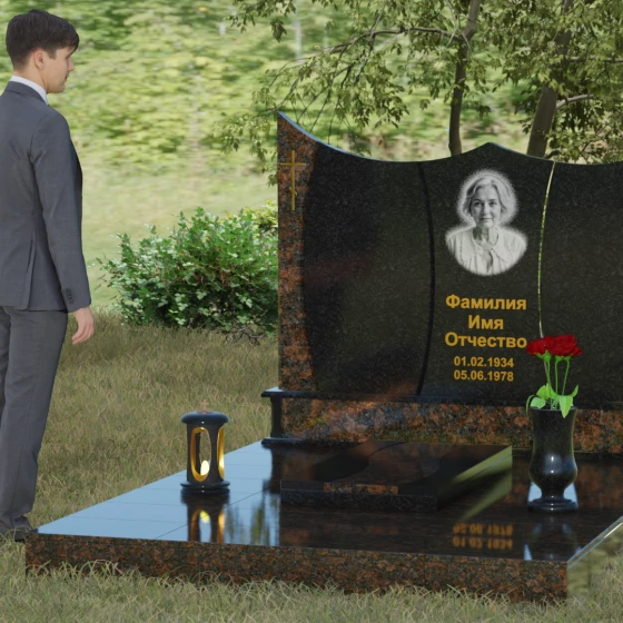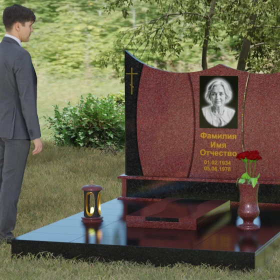 Данная модель представляет собой завершенное решение для обустройства места захоронения. Монумент установлен на массивный гранитный цоколь, который не только обеспечивает конструктивную устойчивость, но и задает границы священного пространства. Вместо традиционного открытого цветника здесь используется сплошная надгробная плита с декоративными вставками, повторяющими изгибы основной стелы. Такое решение создает эстетически законченный вид и максимально упрощает уход за участком: полированная поверхность камня препятствует скоплению пыли и прорастанию сорных трав.