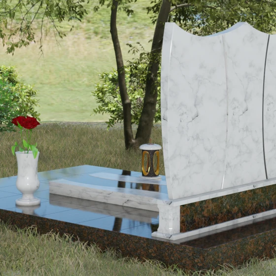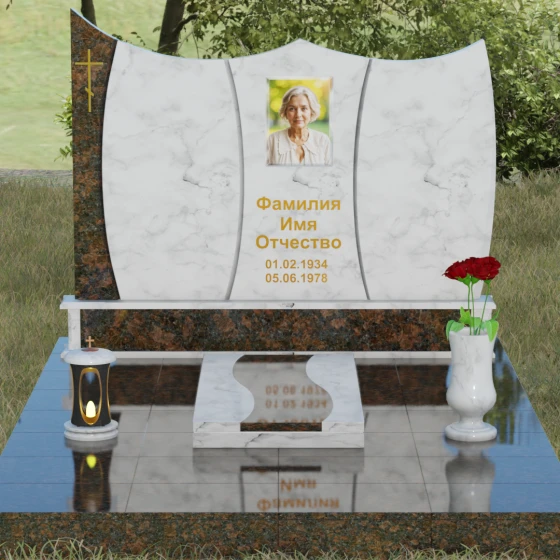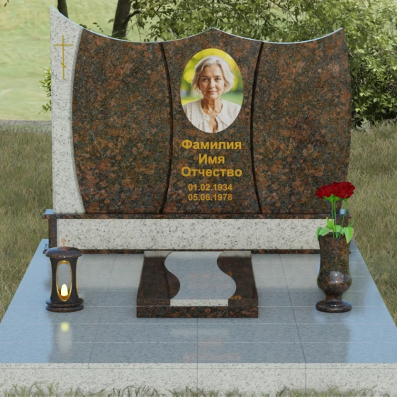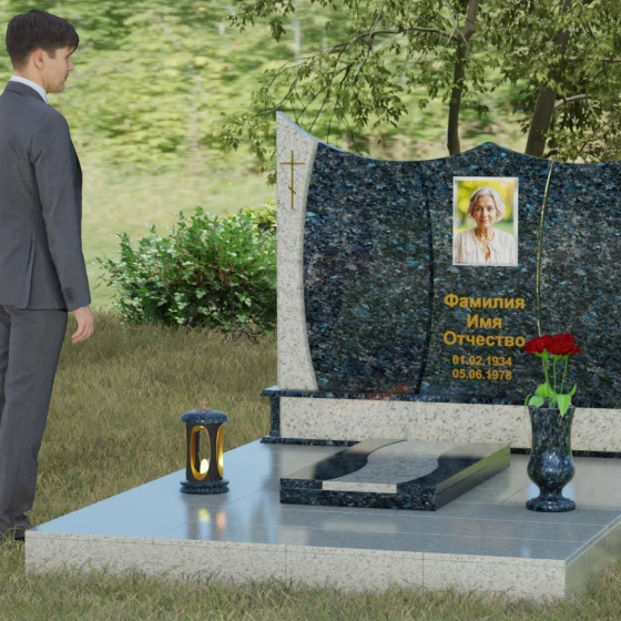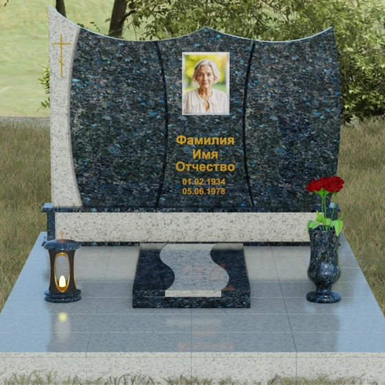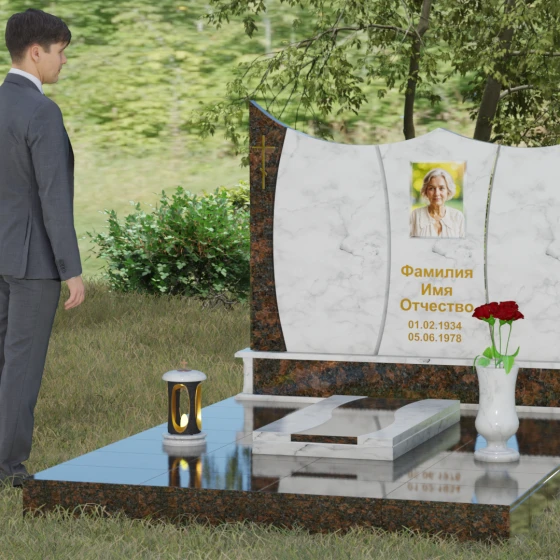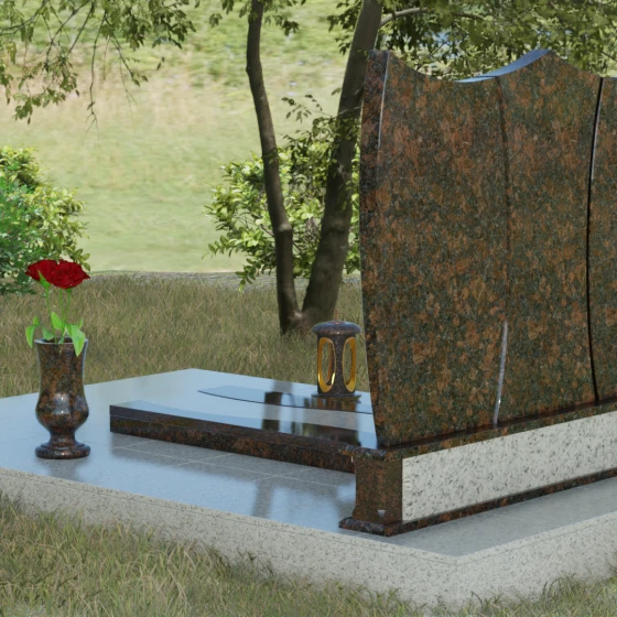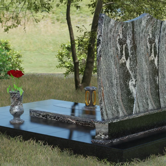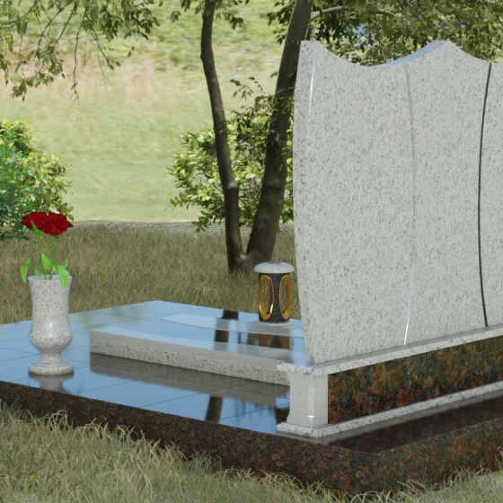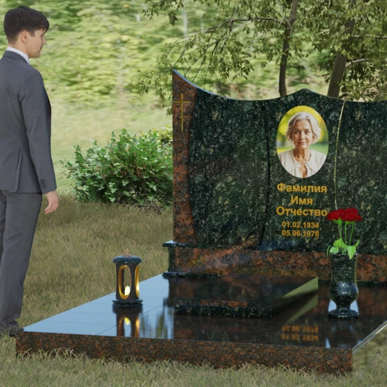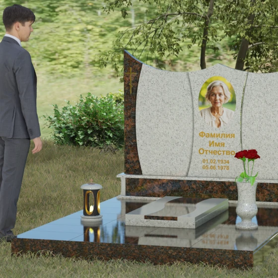 Данная модель представляет собой завершенное решение для обустройства места захоронения. Монумент установлен на массивный гранитный цоколь, который не только обеспечивает конструктивную устойчивость, но и задает границы священного пространства. Вместо традиционного открытого цветника здесь используется сплошная надгробная плита с декоративными вставками, повторяющими изгибы основной стелы. Такое решение создает эстетически законченный вид и максимально упрощает уход за участком: полированная поверхность камня препятствует скоплению пыли и прорастанию сорных трав.