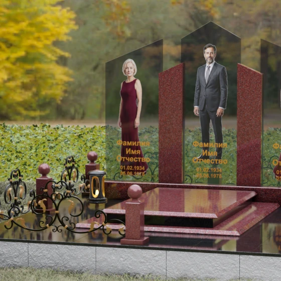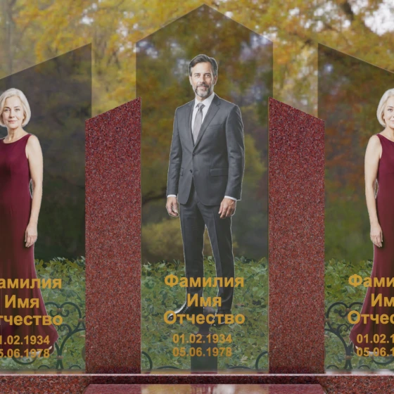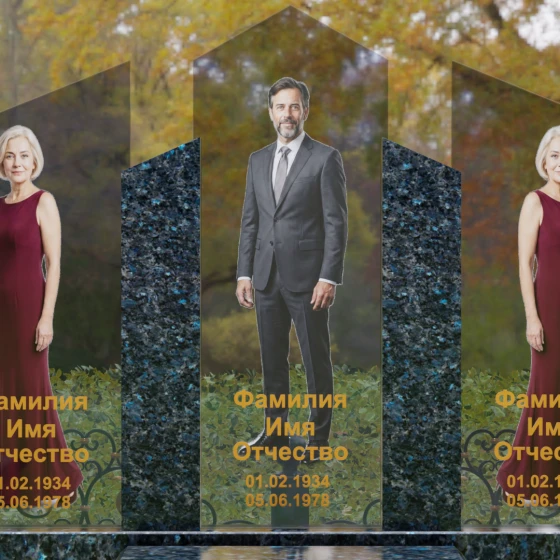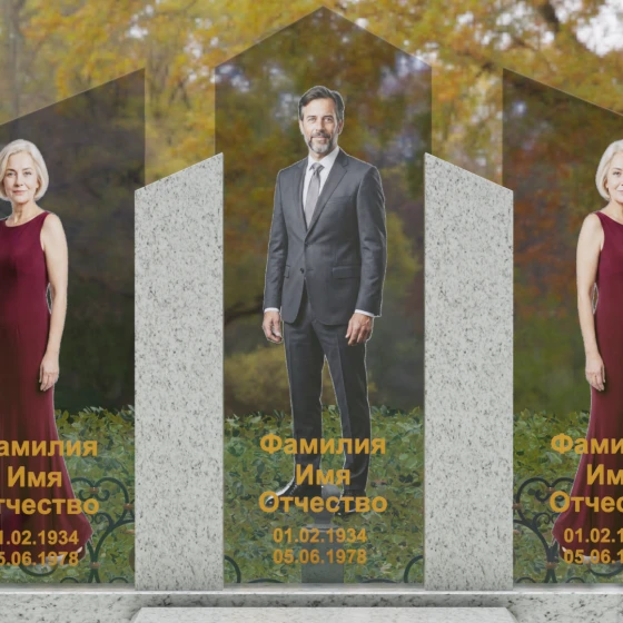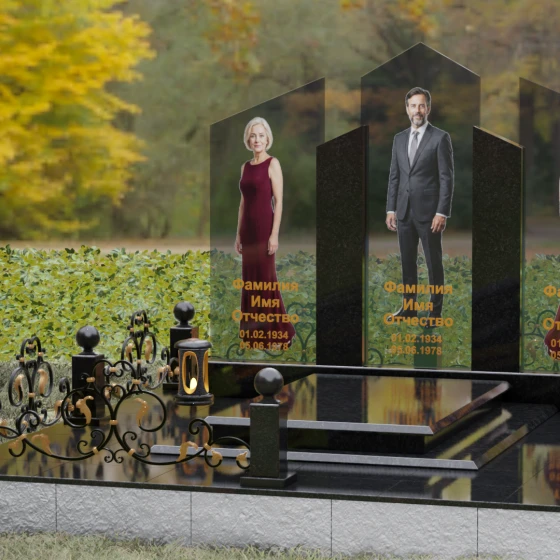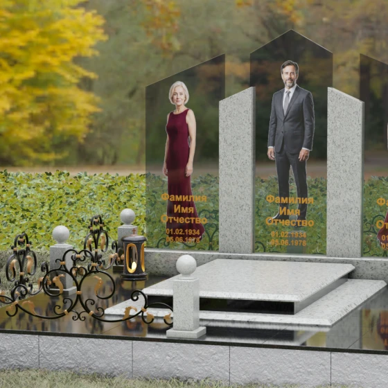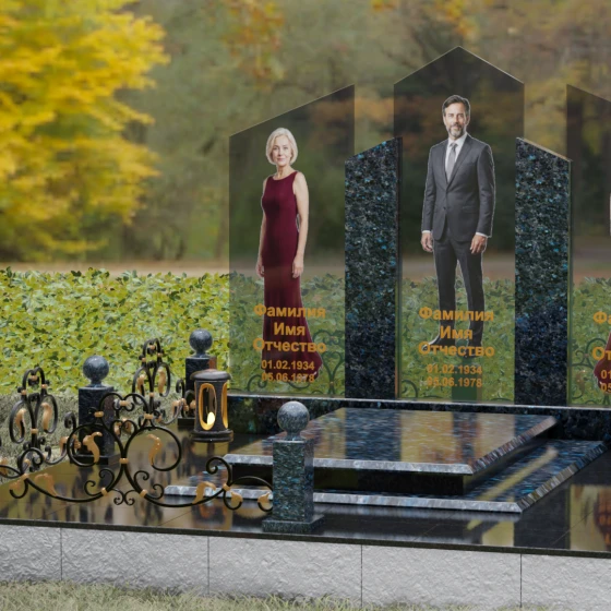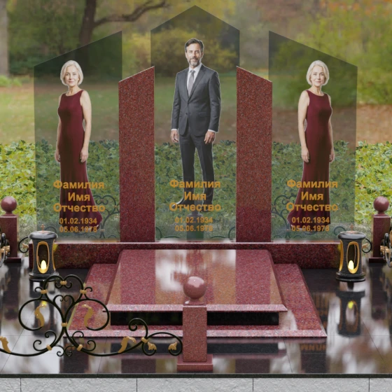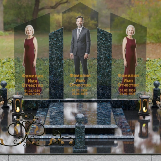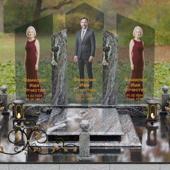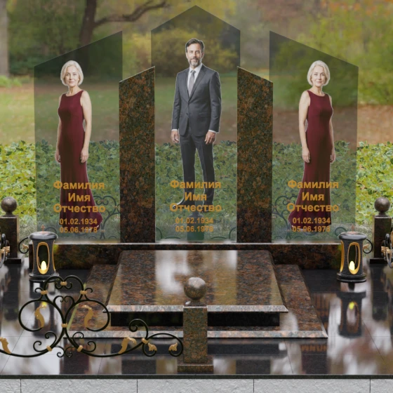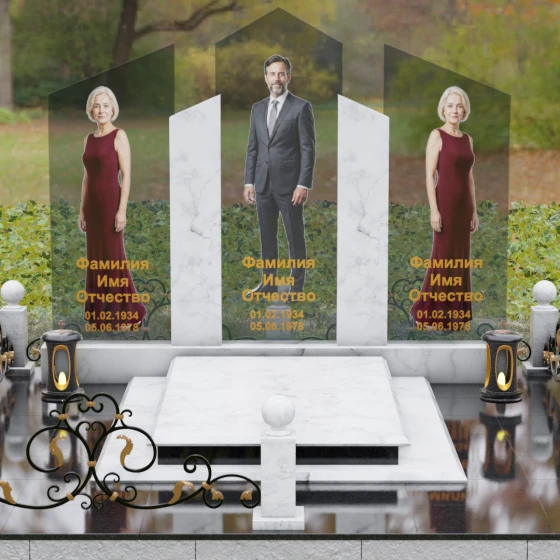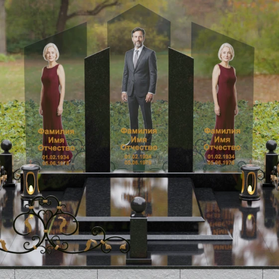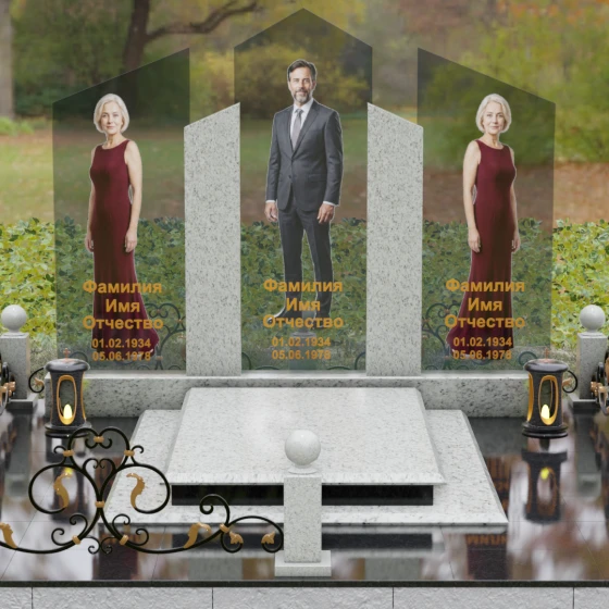 Кому подойдет: Данная мемориальная композиция является идеальным выбором для оформления семейного захоронения на трех человек. Благодаря своему масштабу и возможности размещения портретов в полный рост, она подходит для увековечивания памяти родителей, супругов или целых династий. Это решение для тех, кто ценит современный стиль, надежность и желает создать на месте захоронения атмосферу торжественного спокойствия и эстетического совершенства, выделяя участок среди типовых решений.