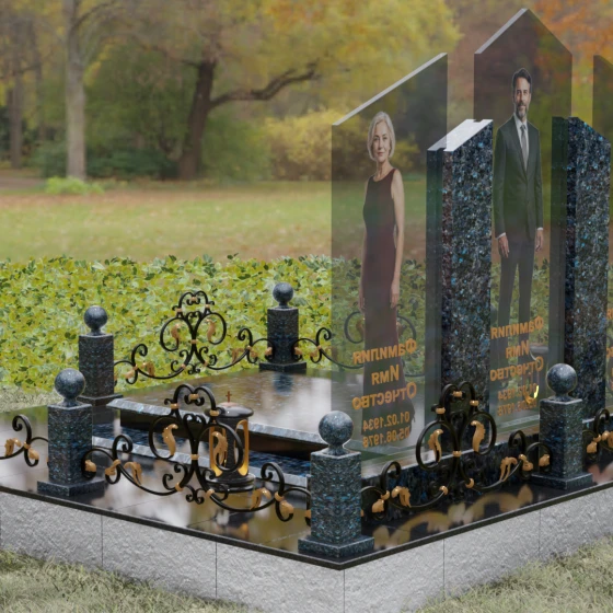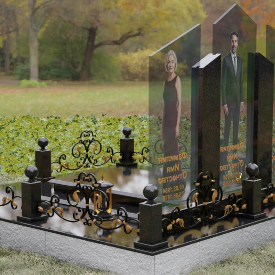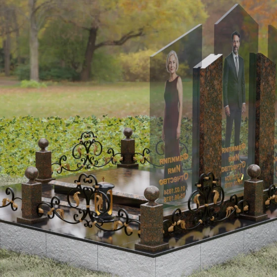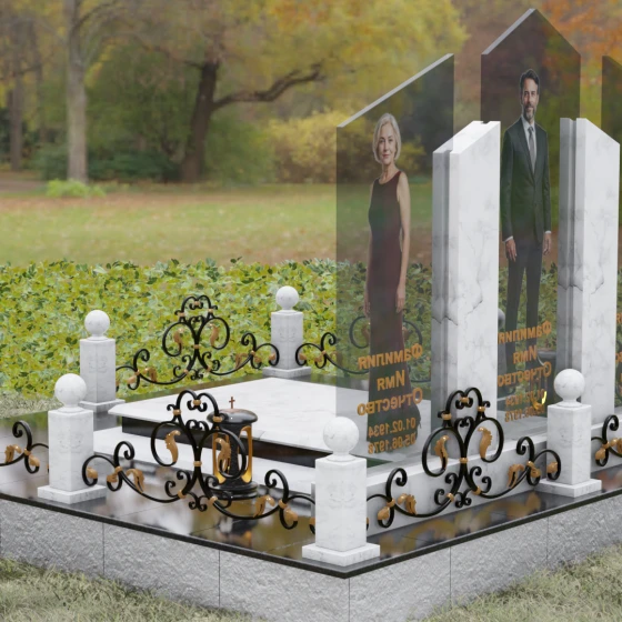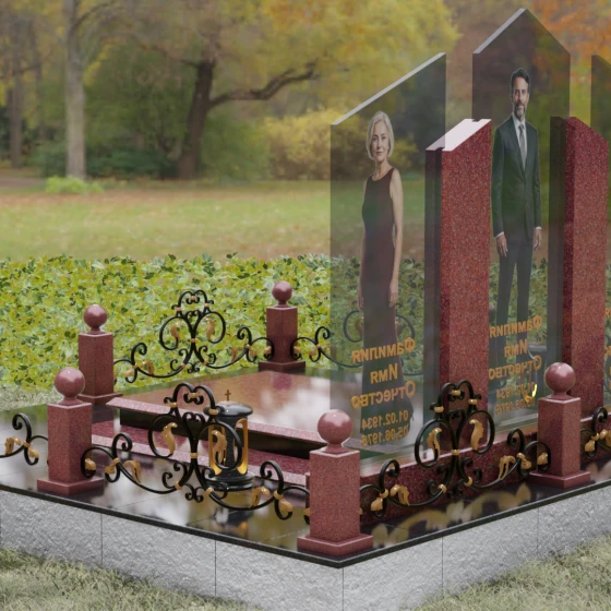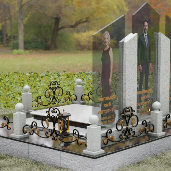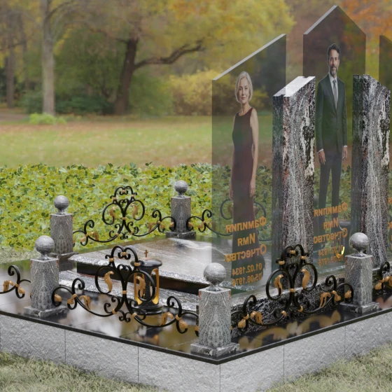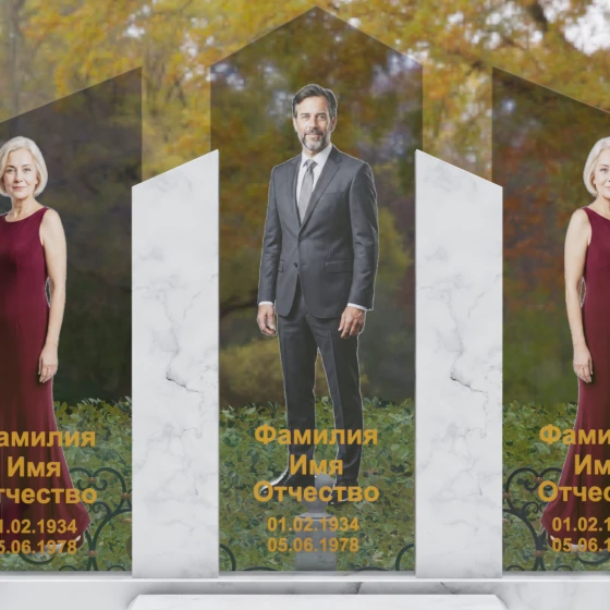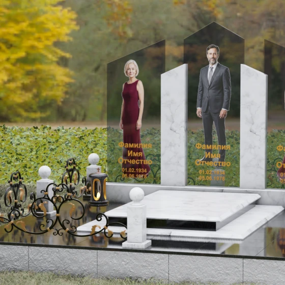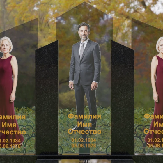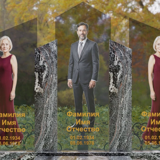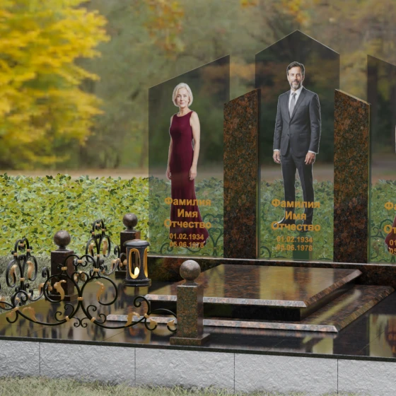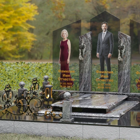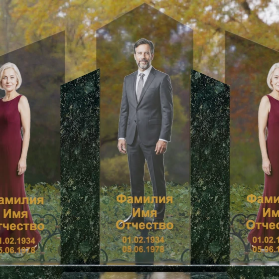 Кому подойдет: Данная мемориальная композиция является идеальным выбором для оформления семейного захоронения на трех человек. Благодаря своему масштабу и возможности размещения портретов в полный рост, она подходит для увековечивания памяти родителей, супругов или целых династий. Это решение для тех, кто ценит современный стиль, надежность и желает создать на месте захоронения атмосферу торжественного спокойствия и эстетического совершенства, выделяя участок среди типовых решений.