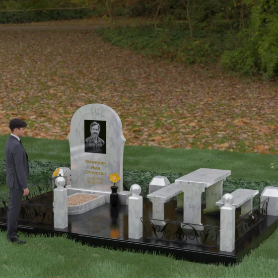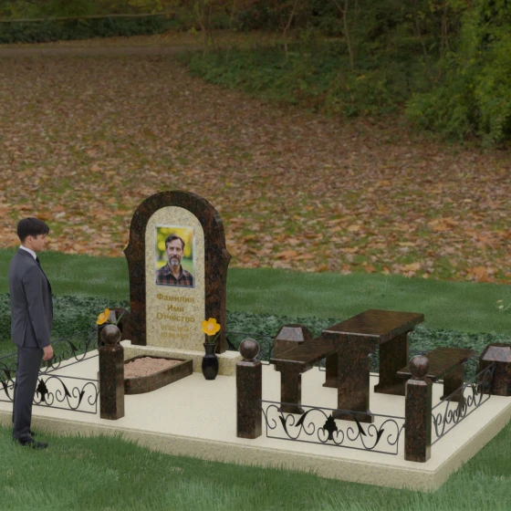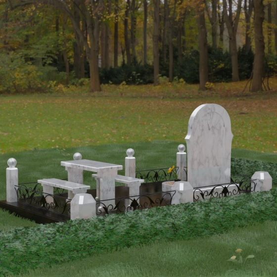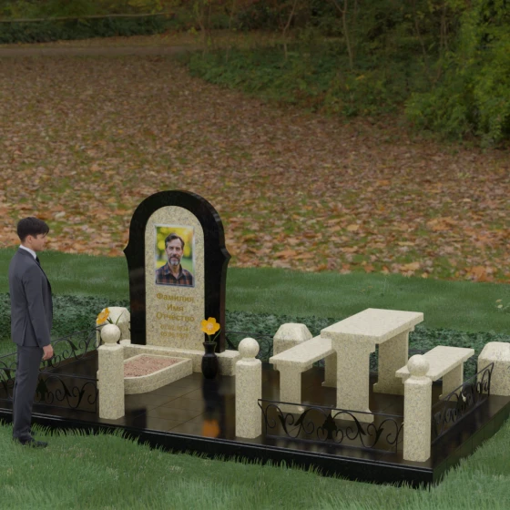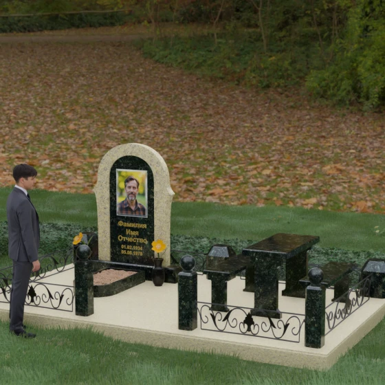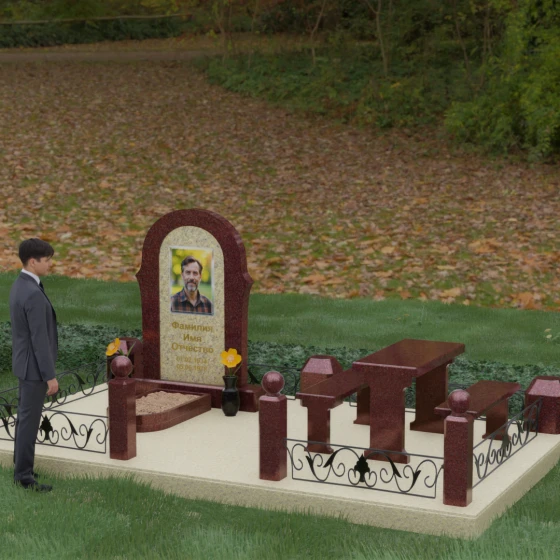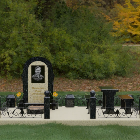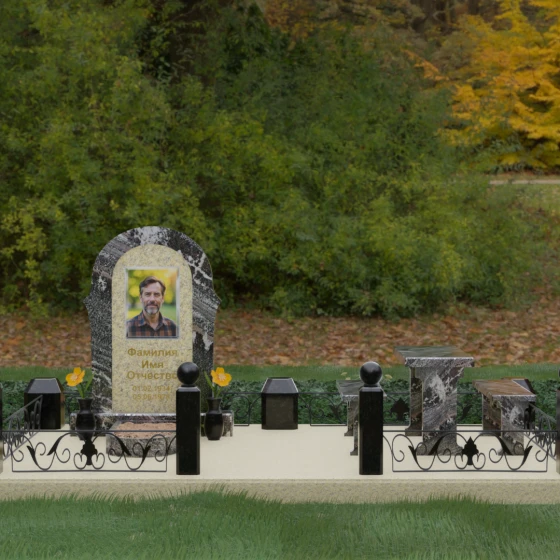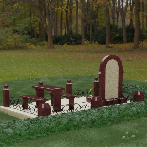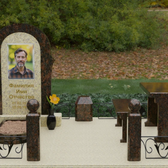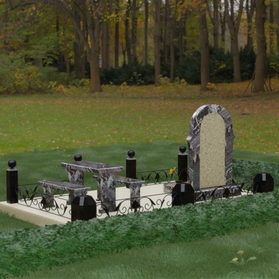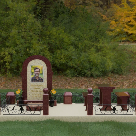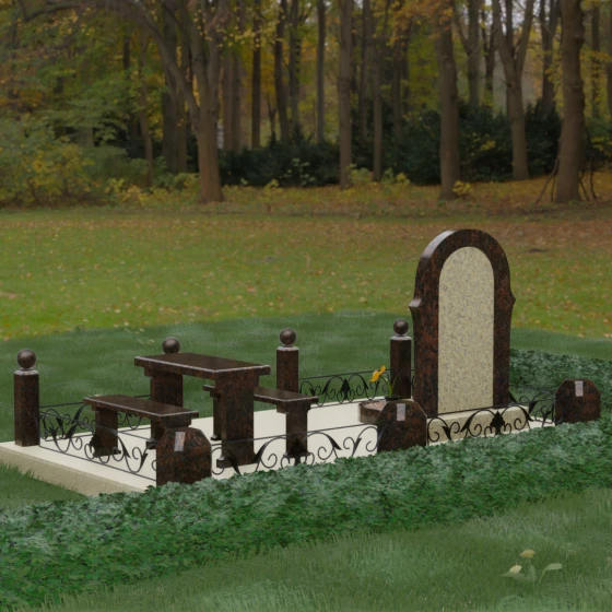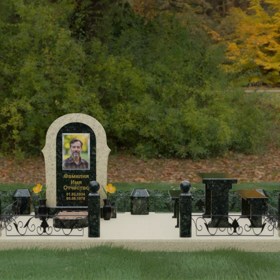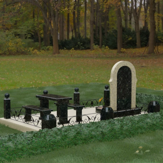 - Элементы благоустройства: Монолитный цоколь, каменное мощение, декоративные вазы, кованое ограждение с гранитными столбами, мемориальный стол и лавки.