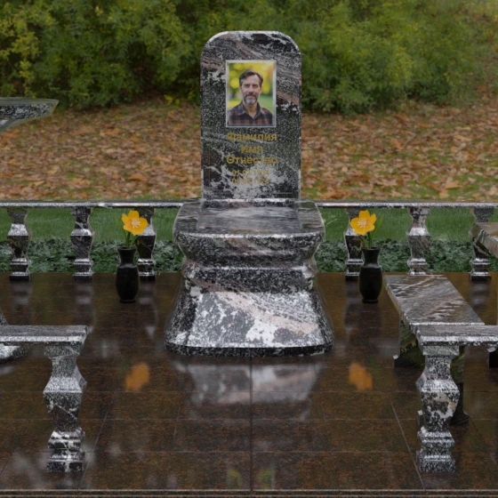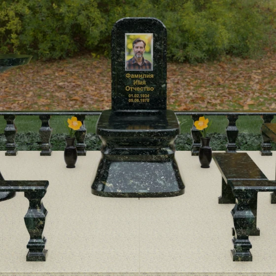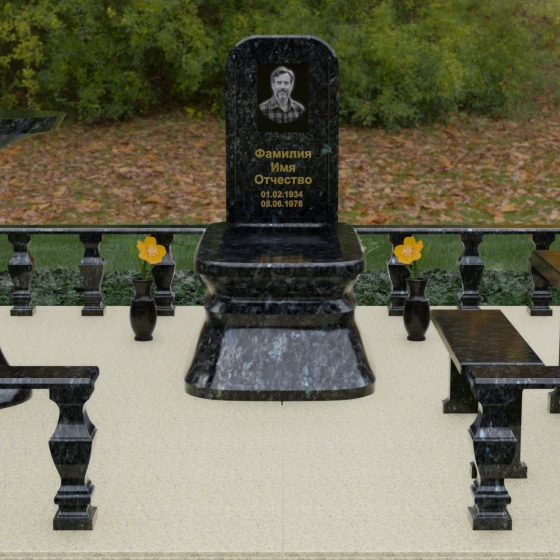 - Массивный гранитный стол и две скамьи на резных опорах, позволяющие близким в уединении провести время в воспоминаниях;