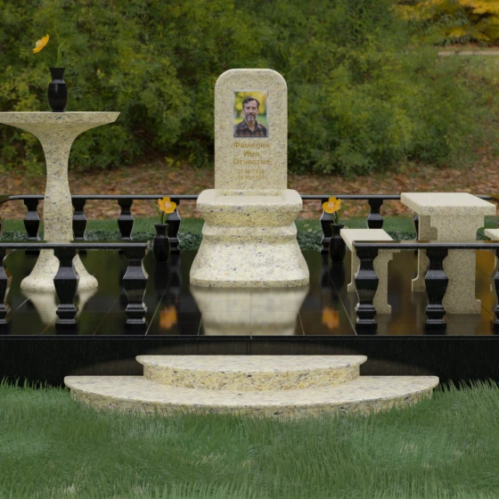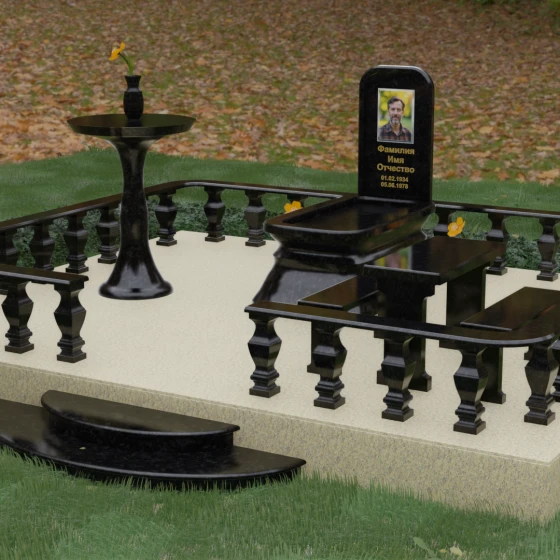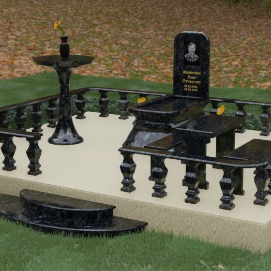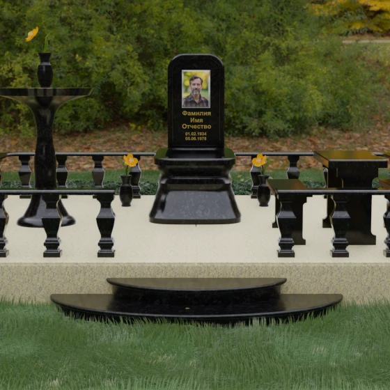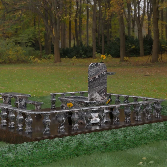 Форма данного надгробного сооружения наполнена глубокими смыслами. Высокая стела, устремленная вверх, символизирует путь души к свету, а её основательность и широкий постамент — незыблемость земной памяти. Закрытая территория, очерченная каменным ограждением, создает сакральное пространство, защищенное от суеты внешнего мира, обеспечивая покой и защиту. Каждая деталь — от фасок на гранях до плавных изгибов балясин — говорит о завершенности жизненного пути и вечности, в которой теперь пребывает ушедший.