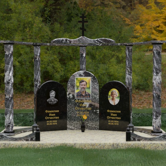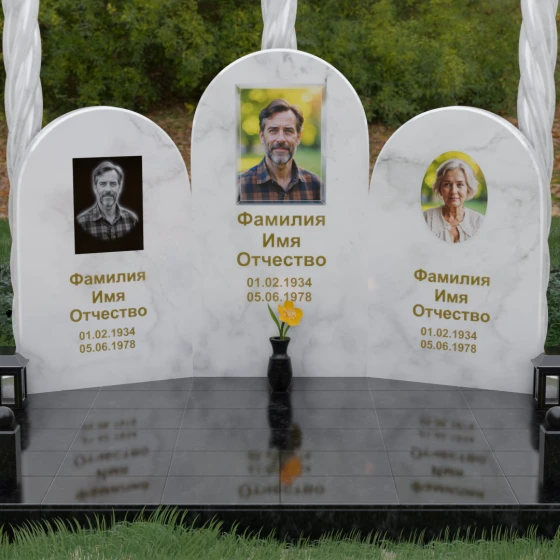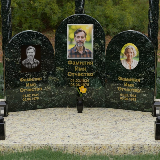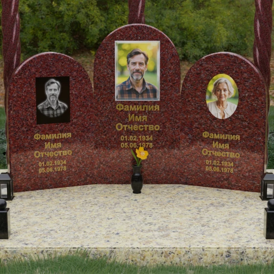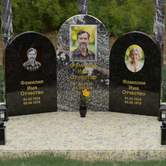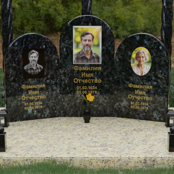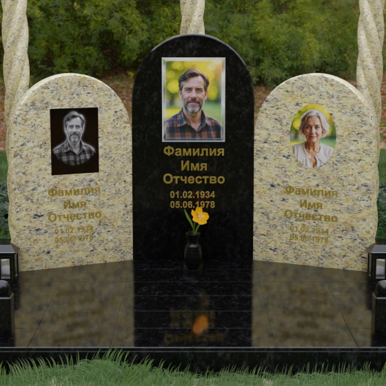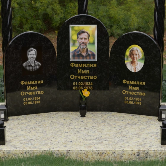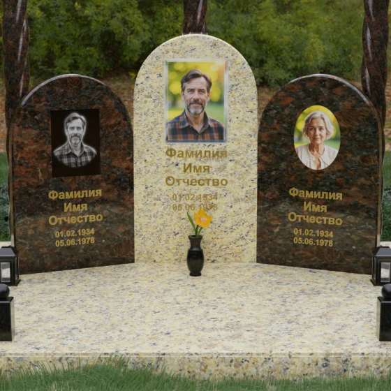 Центральная и боковые плиты предоставляют обширное пространство для художественного оформления. На темных видах гранита безупречно смотрится классическая лазерная гравировка портретов, передающая мельчайшие черты лица. Для цветных камней и мрамора мы рекомендуем установку фотокерамики или портретов на стекле в глубоких нишах, что добавит композиции современности и яркости. Золоченая гравировка имен и дат на фоне зеркально отполированного камня станет финальным штрихом, венчающим этот монументальный шедевр.