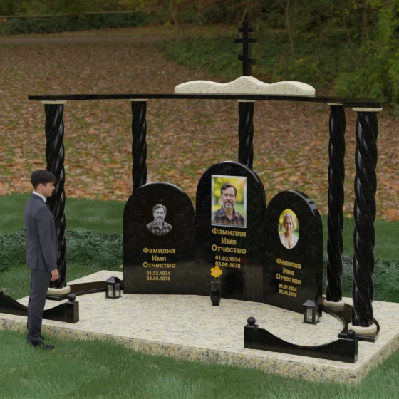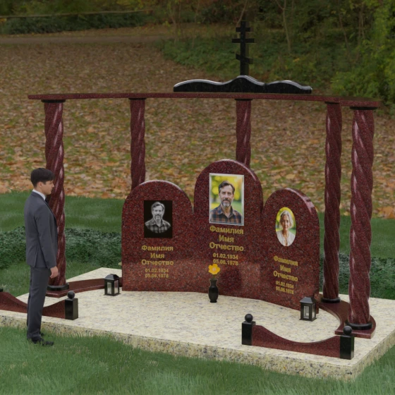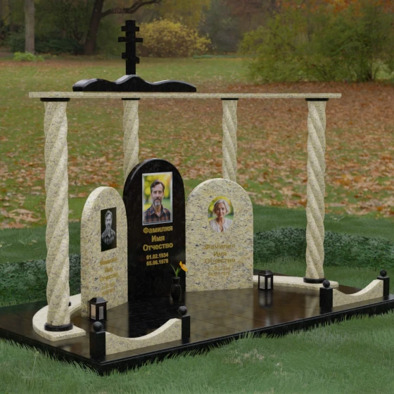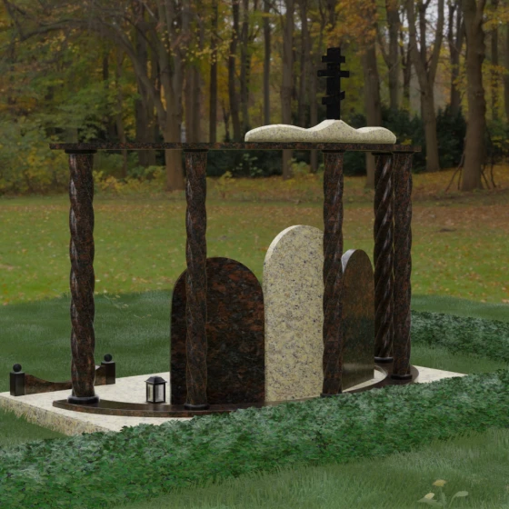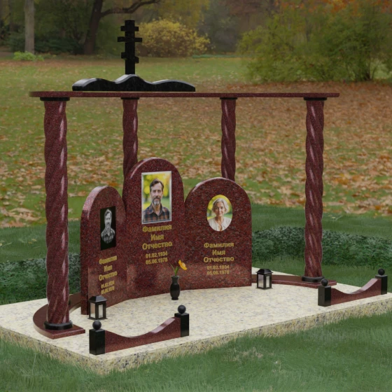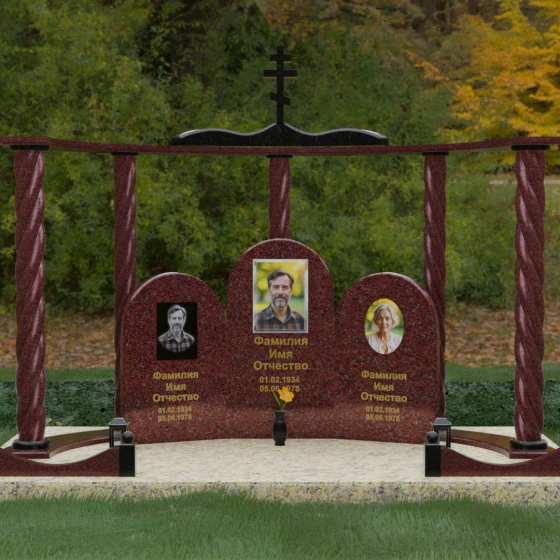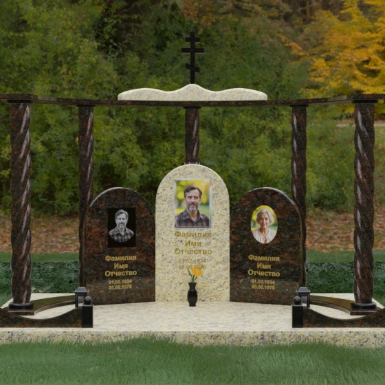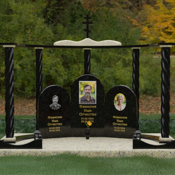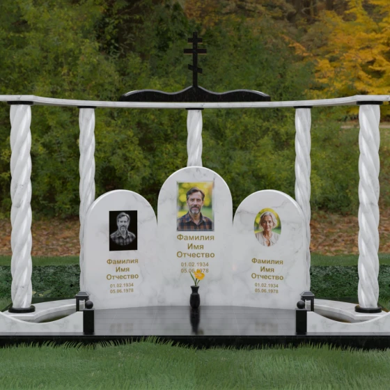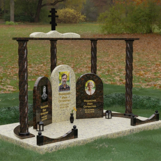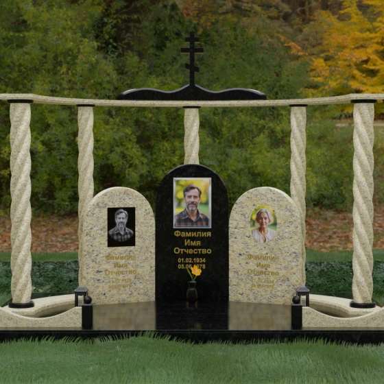 Мемориальный комплекс под артикулом 090 представляет собой гармоничный архитектурный ансамбль, который выходит за рамки привычного понимания памятника. В центре композиции расположена величественная стела с мягким арочным сводом, подчеркивающим торжественность и одухотворенность места захоронения. Ее окружают две симметричные боковые плиты, также выполненные в форме арок, что создает завершенный трехчастный декор, идеально подходящий для семейного захоронения на троих человек. Особое благородство конструкции придают массивные витые колонны, установленные по углам участка. Эти декоративные столбы с глубокой спиралевидной резьбой не просто поддерживают визуальный каркас, но и символизируют восхождение души, создавая величественный образ античного храма или небесных врат.
