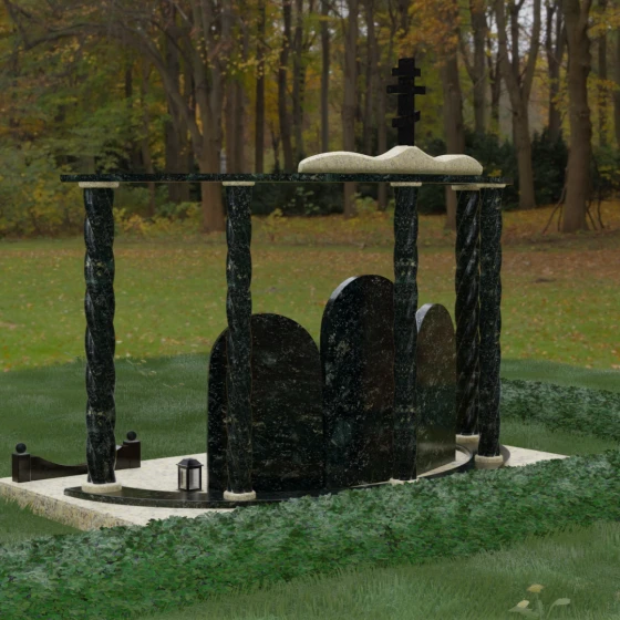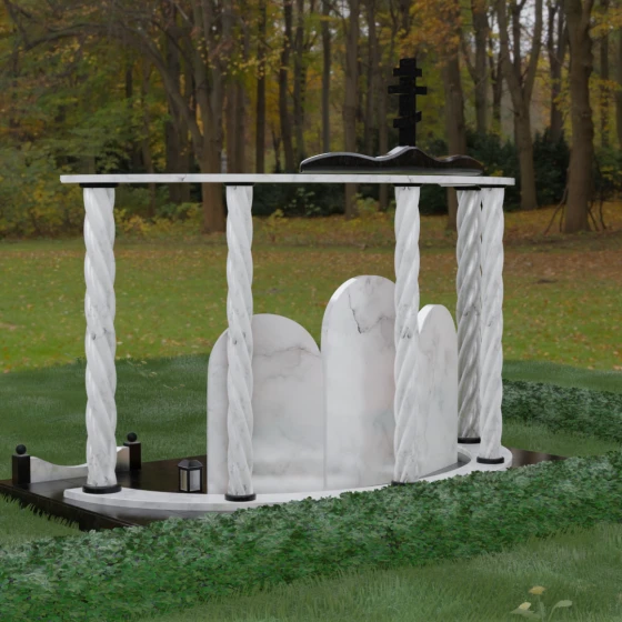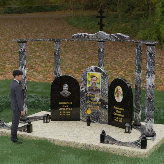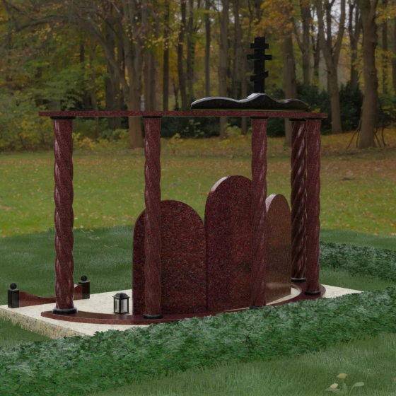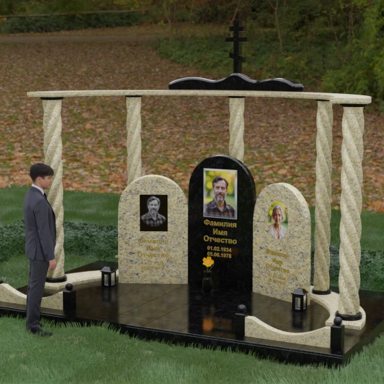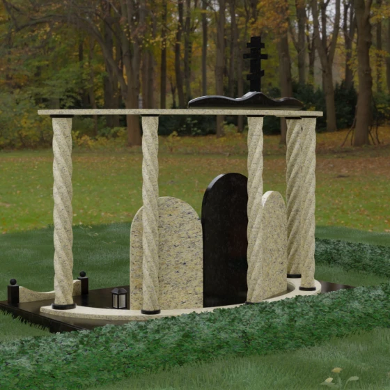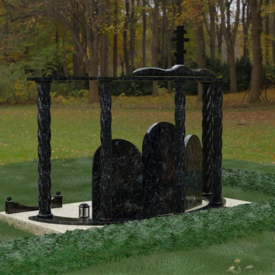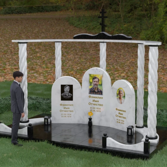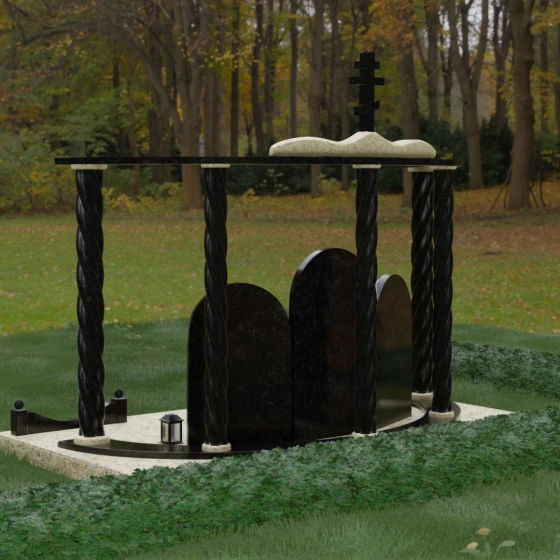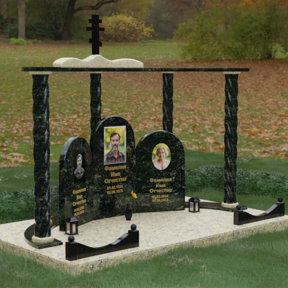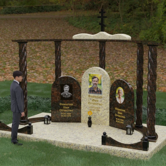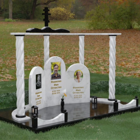 Мемориальный комплекс под артикулом 090 представляет собой гармоничный архитектурный ансамбль, который выходит за рамки привычного понимания памятника. В центре композиции расположена величественная стела с мягким арочным сводом, подчеркивающим торжественность и одухотворенность места захоронения. Ее окружают две симметричные боковые плиты, также выполненные в форме арок, что создает завершенный трехчастный декор, идеально подходящий для семейного захоронения на троих человек. Особое благородство конструкции придают массивные витые колонны, установленные по углам участка. Эти декоративные столбы с глубокой спиралевидной резьбой не просто поддерживают визуальный каркас, но и символизируют восхождение души, создавая величественный образ античного храма или небесных врат.