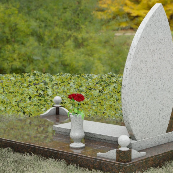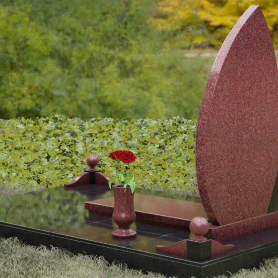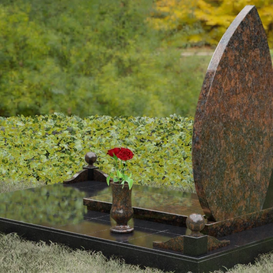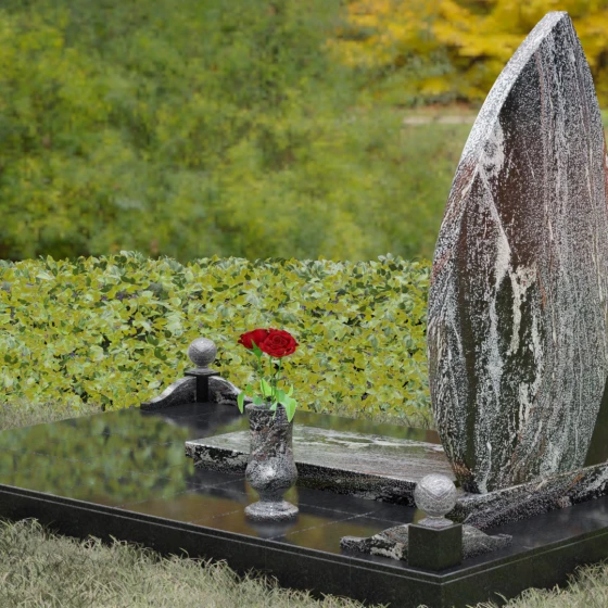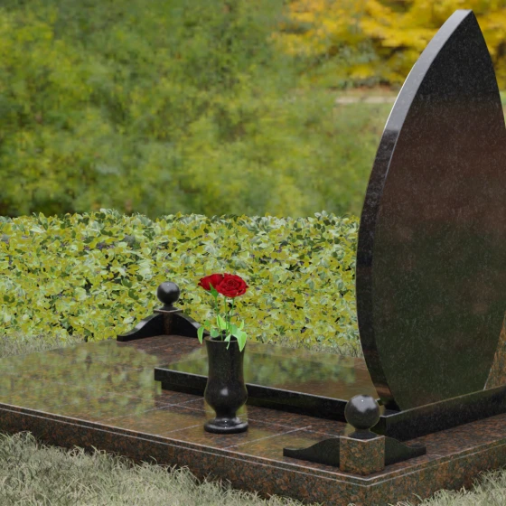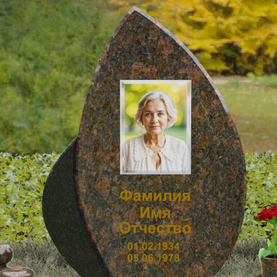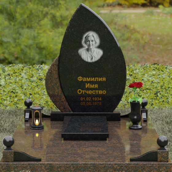 Гранитный монумент под артикулом 093 — это подлинное торжество художественной мысли, воплощенное в благородном камне. Центральный элемент композиции обладает уникальной асимметричной формой, напоминающей лепесток экзотического цветка или застывшее пламя свечи. Плавный изгиб верхней грани устремлен вверх, создавая ощущение легкости и одухотворенности, несмотря на внушительный вес материала. Особенную глубину композиции придает многослойность: основное полированное полотно дополнено тыльным элементом с иным типом обработки или другим оттенком камня, что создает эффектный контраст и визуальный объем. Зеркальная полировка лицевой поверхности безупречна — она отражает свет, заставляя грани «дышать» при изменении угла освещения, в то время как фаски и боковые срезы акцентируют внимание на четкости и чистоте линий.
