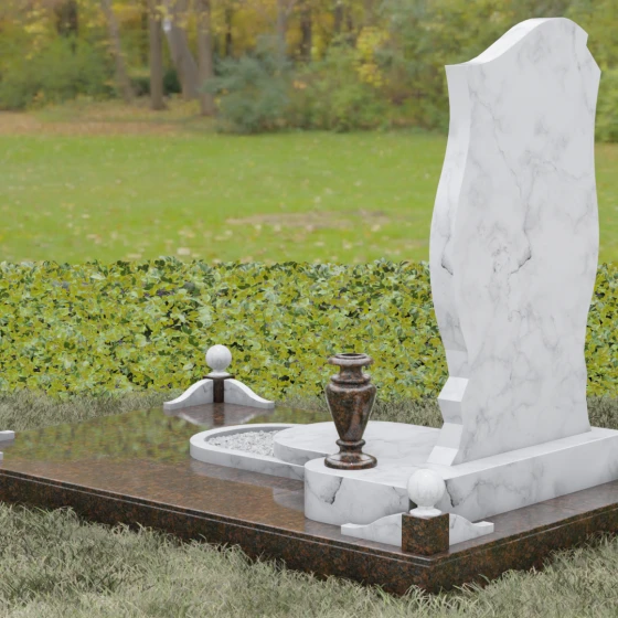 Модель под артикулом 097 представляет собой не просто памятный знак, а цельную архитектурную композицию, в которой мощь натурального камня встречается с изяществом художественной резьбы. Величественная стела приковывает к себе внимание своей сложной геометрией: её верхний край выполнен в виде асимметричной плавной волны, напоминающей застывший на ветру лепесток или язычок пламени. Особого упоминания заслуживает основание вертикального полотна — здесь мастера применили технику глубокой художественной резьбы, создав объемную драпировку в виде ниспадающих лент или морских волн. Этот элемент создает великолепную игру света и тени, подчеркивая монументальность конструкции и придавая ей динамику.