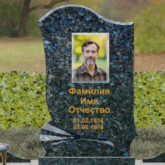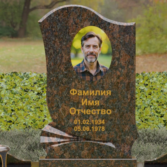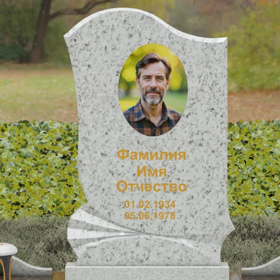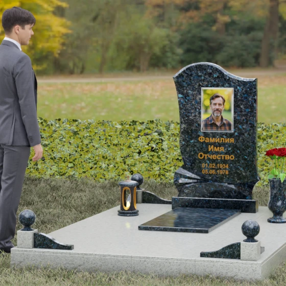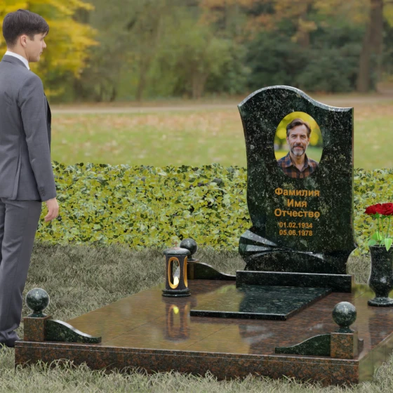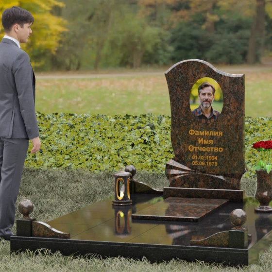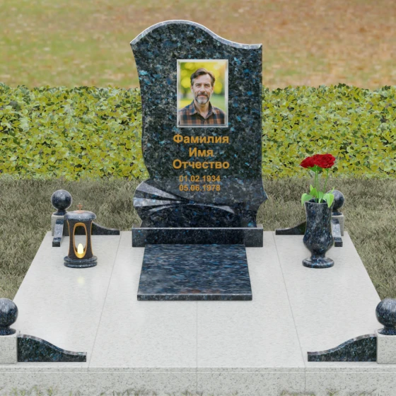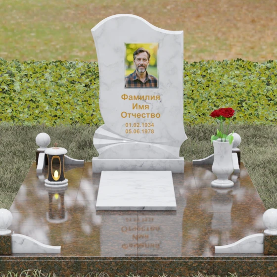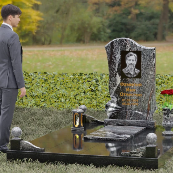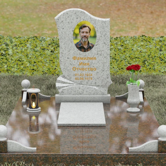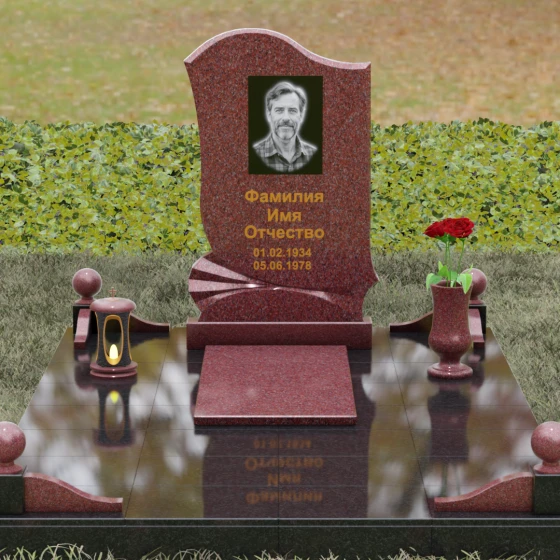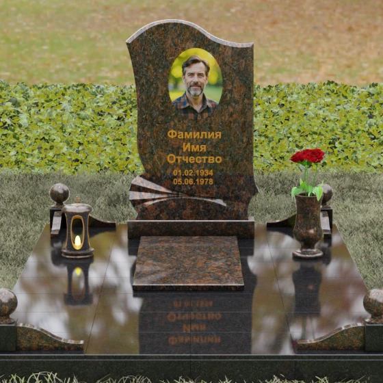 На центральной вертикальной поверхности идеально располагается крупный портрет, выполненный методом художественной гравировки или на фотокерамике. Пространство позволяет разместить памятные надписи, эпитафии и даты жизни, используя глубокую вырубку с покрытием сусальным золотом, что создает эффект свечения. Гармонию мемориального ансамбля дополняют функциональные элементы декора: изящная гранитная ваза, предназначенная для возложения живых цветов, и закрытая каменная лампада. Фонарь лампады защищает огонь свечи от ветра, символизируя вечную память, которая не гаснет. Каждый элемент этого благоустройства продуман до мелочей, чтобы создать достойный образ памяти о дорогом человеке.