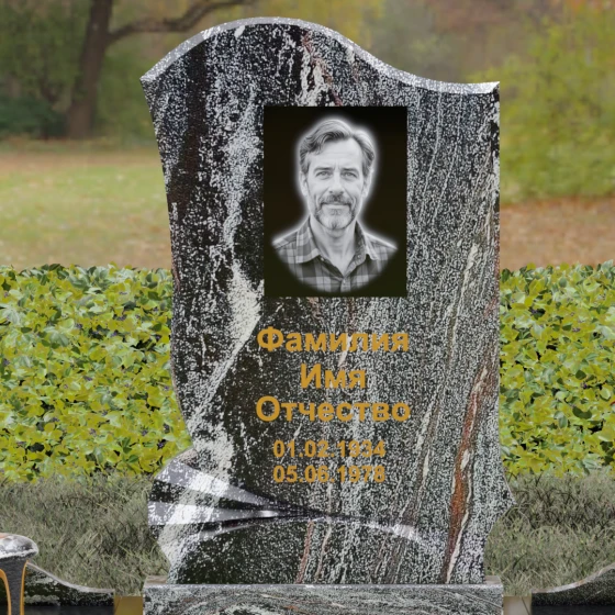 Гранитный монумент артикула 098 представляет собой эталон мемориальной архитектуры, в котором монументальная мощь природного камня гармонично сочетается с изяществом художественных линий. Главным эстетическим акцентом этой модели является асимметричный верхний контур, выполненный в виде плавного ниспадающего изгиба, напоминающего застывшую волну или мягкий край ткани. Такая форма лишена агрессивных углов, что придает месту захоронения атмосферу умиротворения и светлой грусти. Особую ценность представляет сложная резьба в нижней части центрального элемента: глубокие фактурные борозды образуют веерный орнамент, имитирующий складки драпировки или раскрытую раковину. Здесь мастерски реализована игра контрастов — матовые, шероховатые поверхности внутри резных элементов подчеркивают безупречную зеркальную полировку основного полотна, создавая объем и визуальную глубину, которую невозможно не заметить.