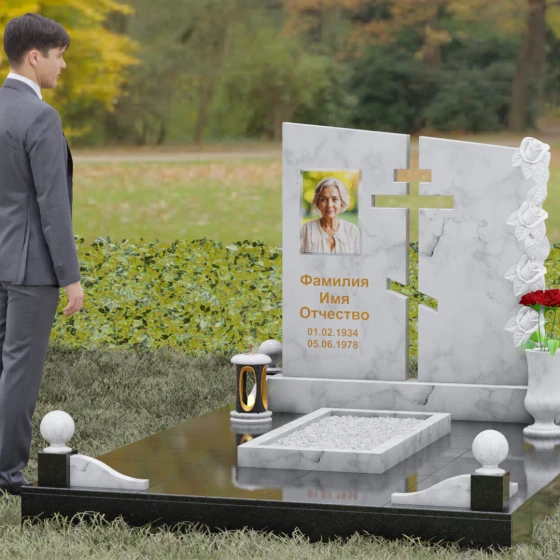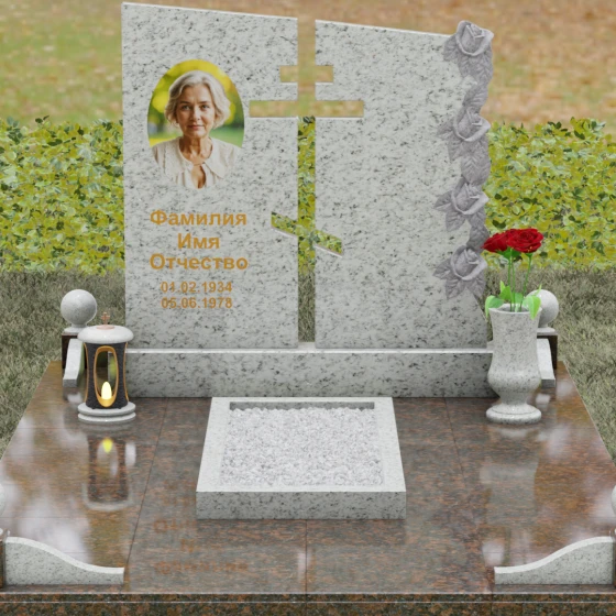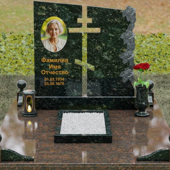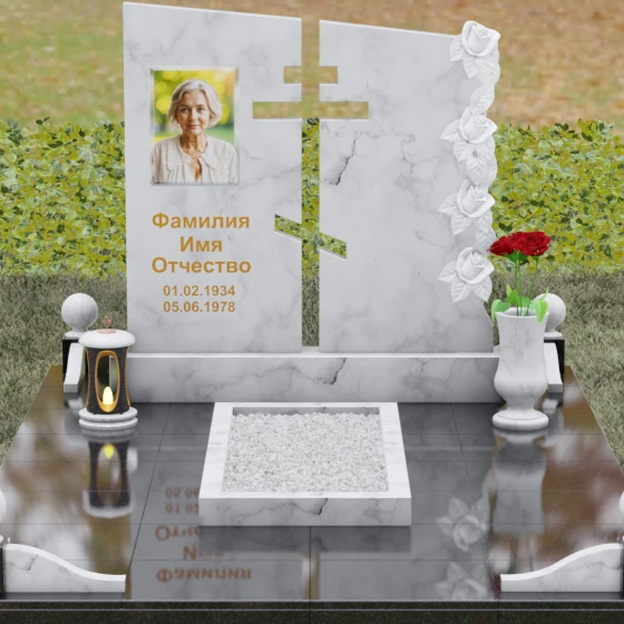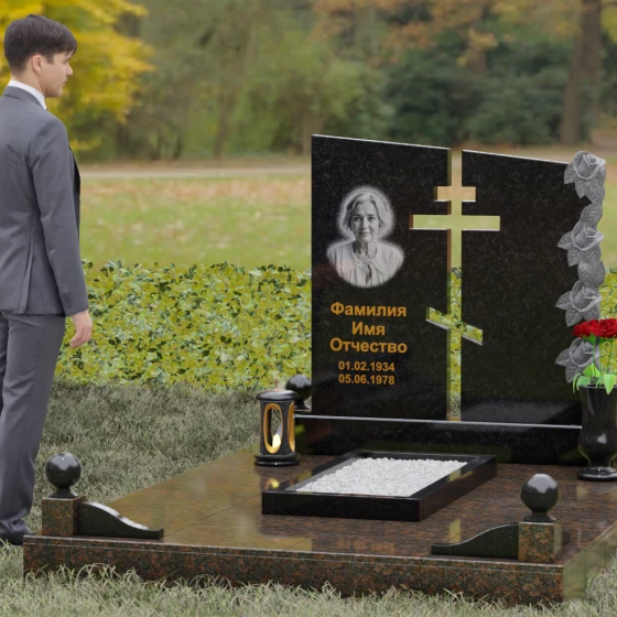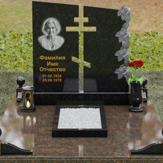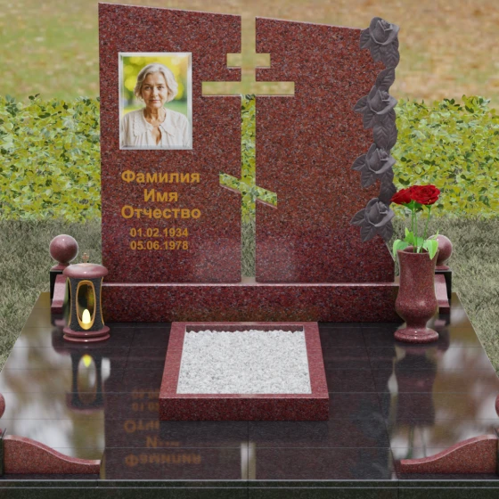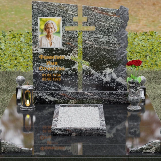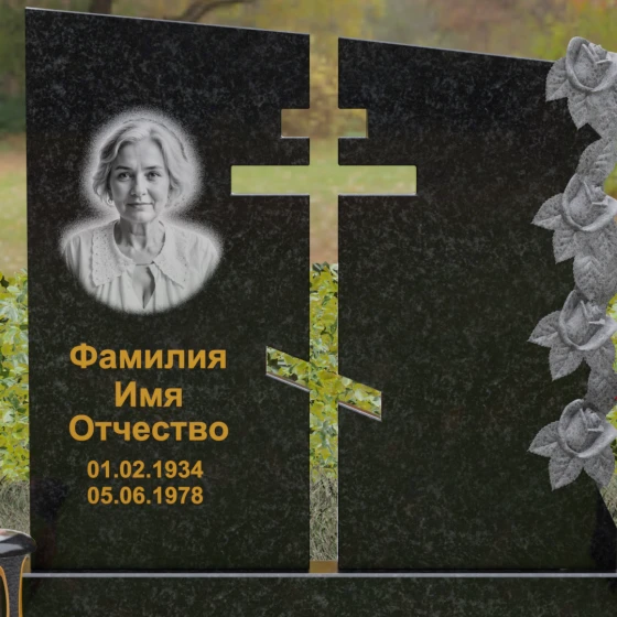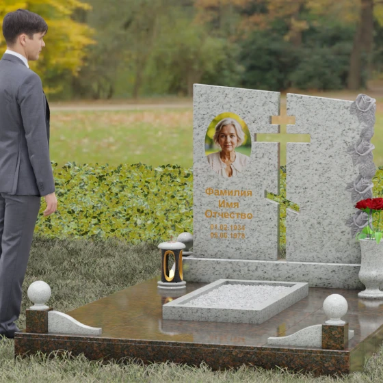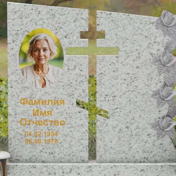 Кому подойдет: Эта мемориальная композиция станет идеальным выбором для тех, кто ищет эстетически совершенное и статусное решение. Благодаря сочетанию православной символики и нежного цветочного орнамента, модель универсальна: она подчеркнет глубину чувств при оформлении женского захоронения (матери, супруге или дочери) или станет достойным выражением памяти о близком человеке, чей жизненный путь был наполнен светом и созиданием. Это выбор для тех, кто ценит долговечность, архитектурную сложность и безупречный стиль в каждой детали.