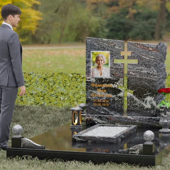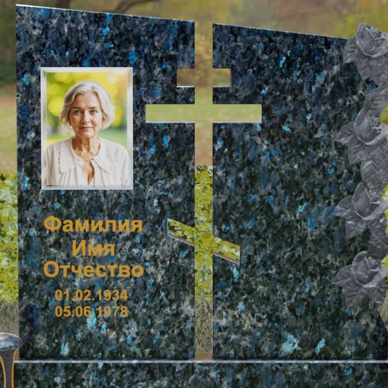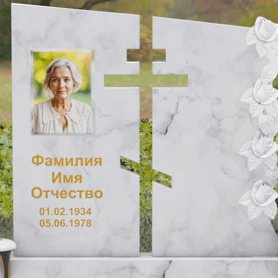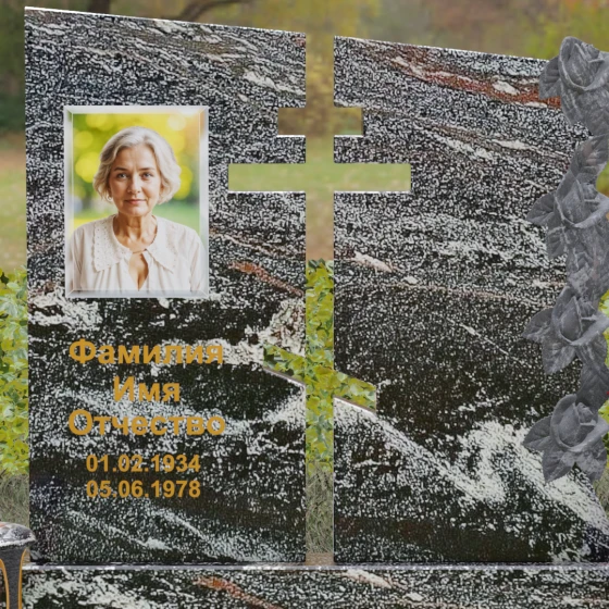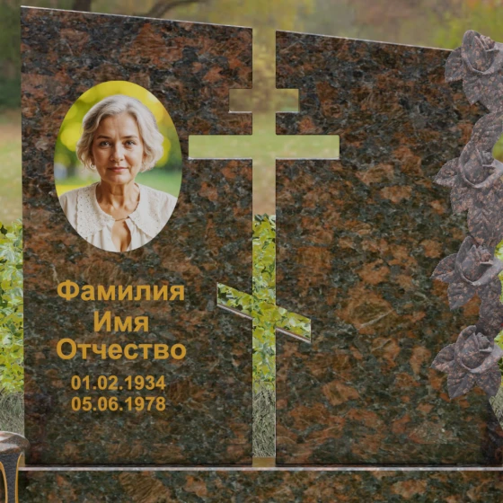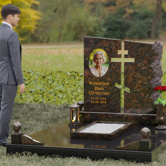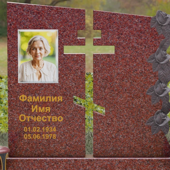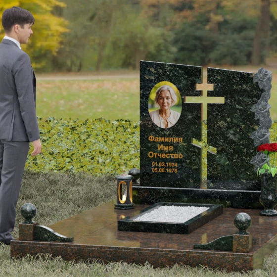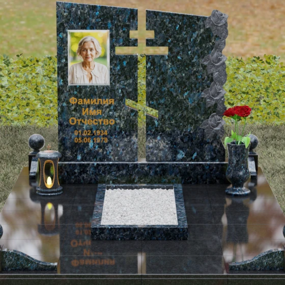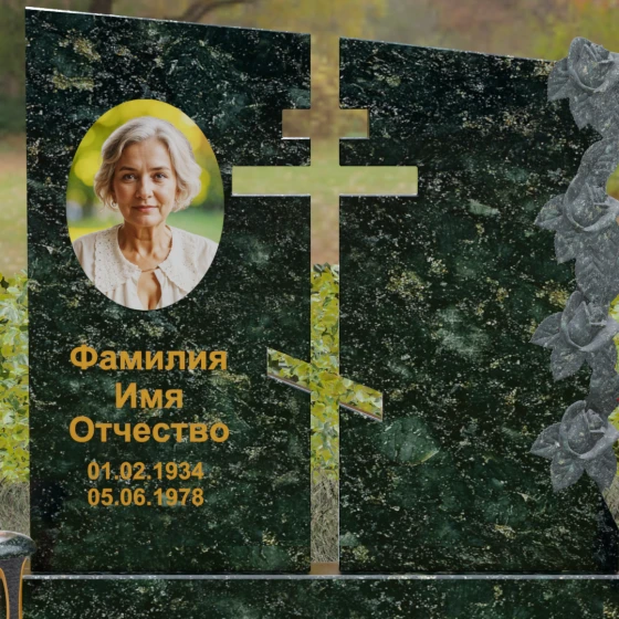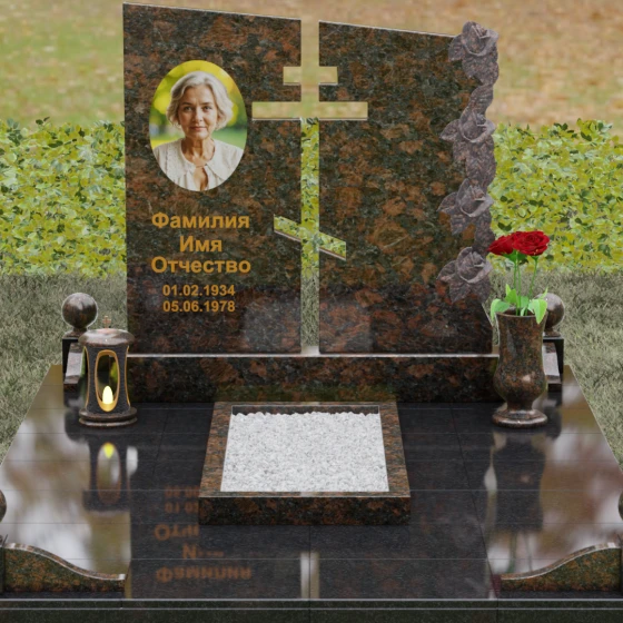 Кому подойдет: Эта мемориальная композиция станет идеальным выбором для тех, кто ищет эстетически совершенное и статусное решение. Благодаря сочетанию православной символики и нежного цветочного орнамента, модель универсальна: она подчеркнет глубину чувств при оформлении женского захоронения (матери, супруге или дочери) или станет достойным выражением памяти о близком человеке, чей жизненный путь был наполнен светом и созиданием. Это выбор для тех, кто ценит долговечность, архитектурную сложность и безупречный стиль в каждой детали.