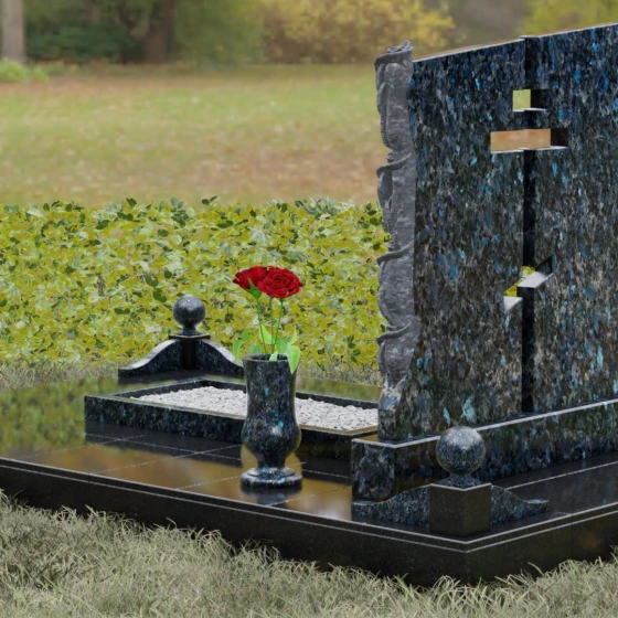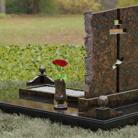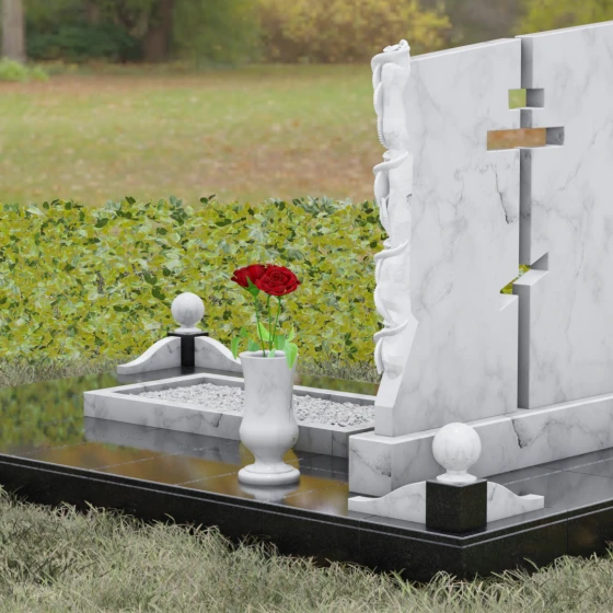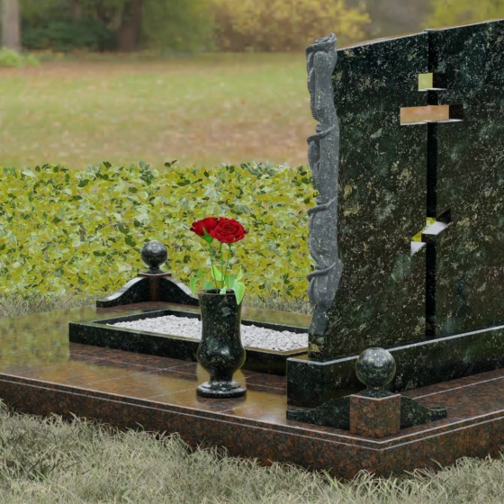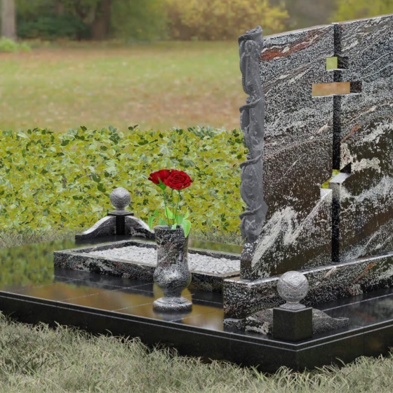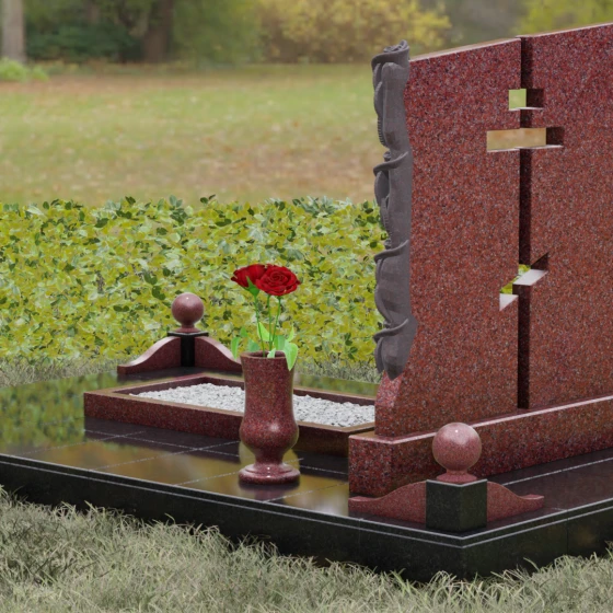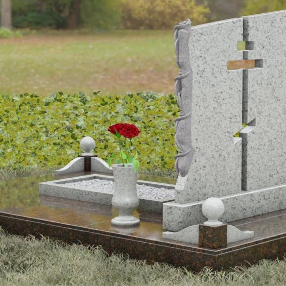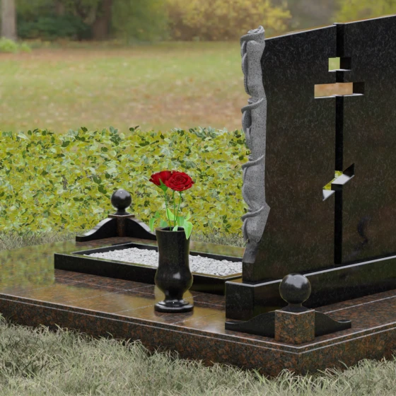 Данная мемориальная композиция представляет собой сложный архитектурный ансамбль, центральным элементом которого является асимметричная двухсоставная стела. Главная художественная доминанта модели — сквозная прорезь в форме лаконичного православного креста, разделяющая монумент на две части. Этот прием создает уникальную игру света: лучи проходят сквозь камень, символизируя торжество духа и вечную память, которая не знает преград. Левая часть обелиска предназначена для размещения портрета и мемориальных надписей, в то время как правая грань украшена великолепной объемной резьбой. Вдоль всего края стелы «расцветает» гирлянда из роз. Каждое соцветие выполнено в технике глубокого барельефа: вы можете видеть каждый изгиб лепестка, их бархатистую фактуру и природную пышность. Мастерски переданный объем бутонов контрастирует со строгими линиями камня, принося в общую эстетику нотки нежности и светлой грусти.