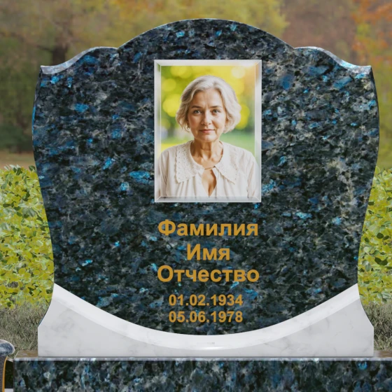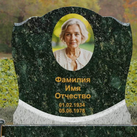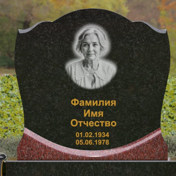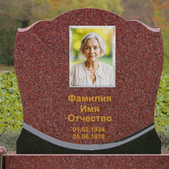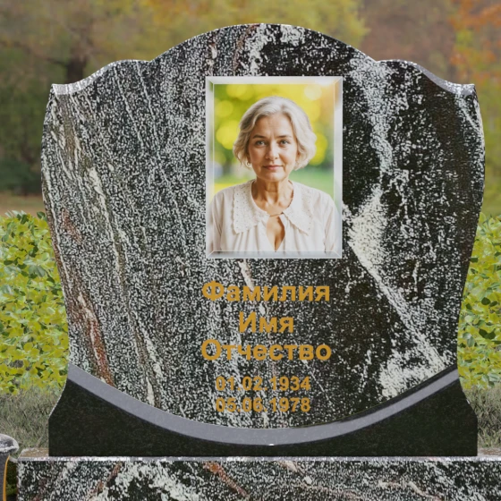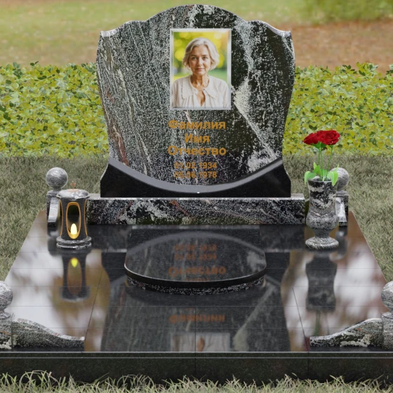 Центральным элементом композиции является вертикальная стела с уникальной геометрией навершия. Верхний контур плиты выполнен в форме сложной, симметричной волны, напоминающей очертания короны или раскрытого свитка. Идеально отполированные фаски по краям стелы создают игру света, подчеркивая объем и благородство камня. Зеркальная полировка лицевой стороны предназначена для нанесения высокохудожественных портретов и каллиграфических надписей, которые на таком фоне выглядят особенно четко и торжественно.
