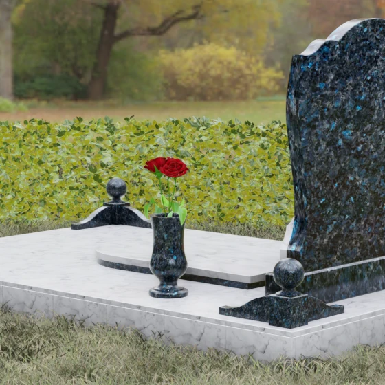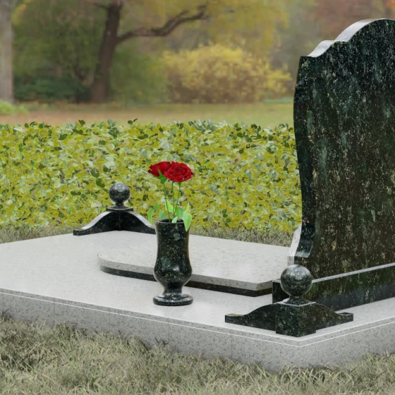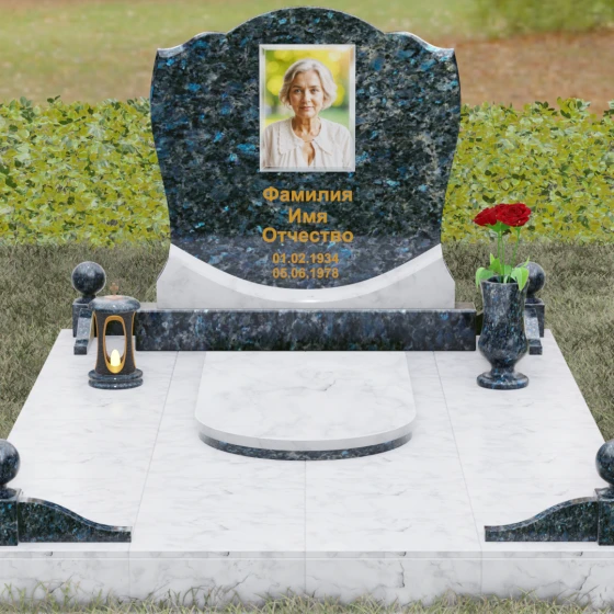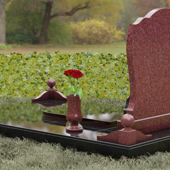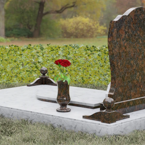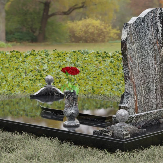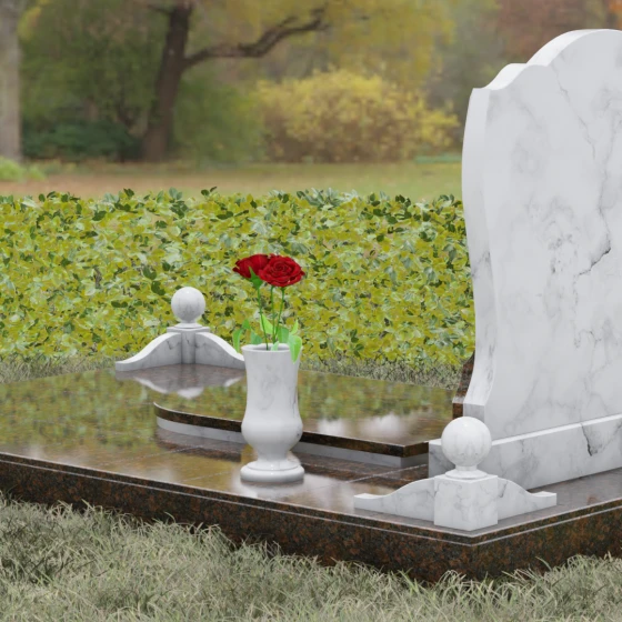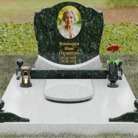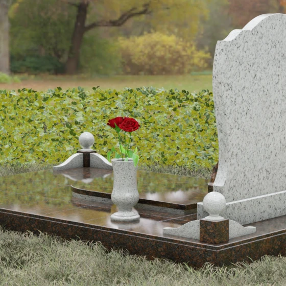 - Декоративные элементы: Углы комплекса акцентированы столбиками с навершиями в виде полированных шаров — символов завершенности земного пути. Композицию гармонично дополняют интегрированная каменная лампада и изящная ваза, предназначенная для возложения цветов.