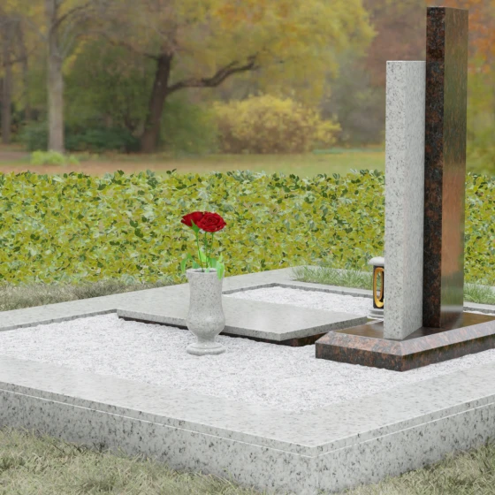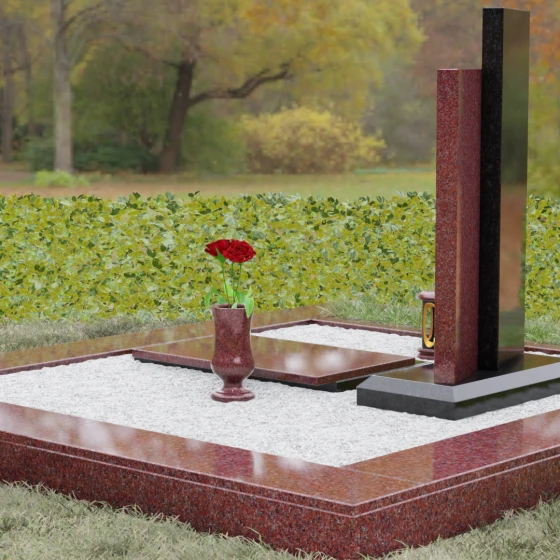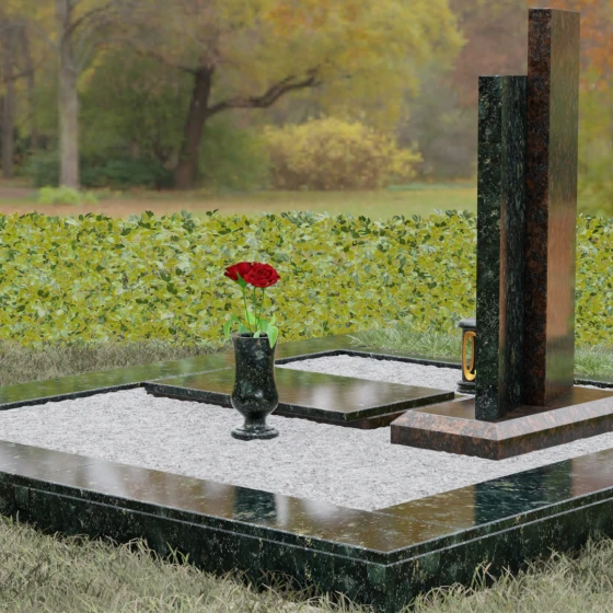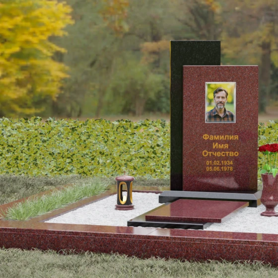 Целостность и эстетика места захоронения зависят не только от стелы, но и от оформления всего участка. Данное изделие устанавливается на массивный гранитный цоколь, который служит надежным фундаментом и придает всей конструкции монументальную устойчивость. По периметру участок может быть обрамлен каменным бордюром, создающим четкие границы сакрального пространства. Надгробная плита, выполненная в единой стилистике со стелой, полностью закрывает цветник, что не только придает комплексу законченный и аккуратный вид, но и значительно упрощает уход за ним, исключая рост сорняков и скопление грязи. Каждая деталь — от подставки до полированной плиты — работает на создание атмосферы глубокого уважения и вечного покоя.
