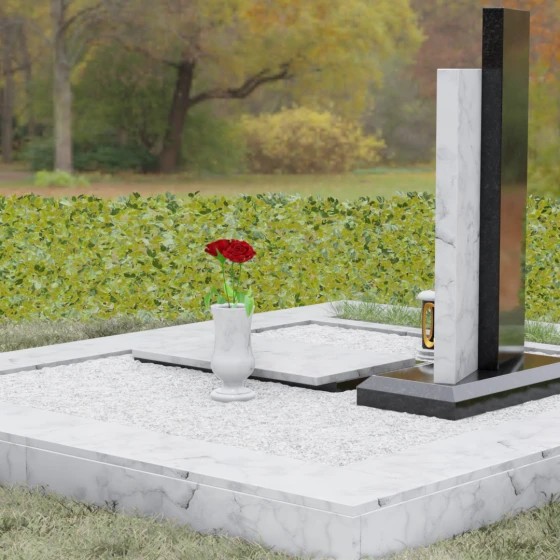В основе композиции лежит высокая вертикальная стела, выполненная из благородного натурального камня. Главным акцентом модели является филигранная резьба: в верхней части мемориала высечен православный крест. Его формы лаконичны и одновременно величественны, а благодаря глубокой проработке рельефа создается впечатляющий контраст. Зеркальная, идеально гладкая поверхность основной части стелы отражает небо и окружающий мир, в то время как матовая, бархатистая фактура резного креста подчеркивает его святость и духовное значение.