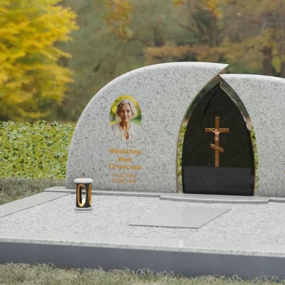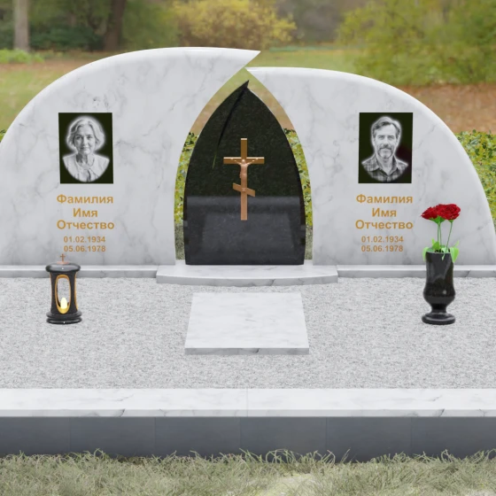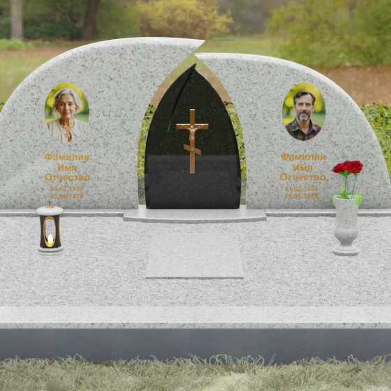Оформление: Форма стелы идеально подходит для парных захоронений. Благодаря большой полезной площади полированных плит, портреты можно расположить симметрично, используя как классическую гравировку, так и цветную фотокерамику. Золоченая гравировка ФИО будет особенно эффектно смотреться на темном фоне, перекликаясь с цветом центрального креста и создавая цельный, дорогой образ.