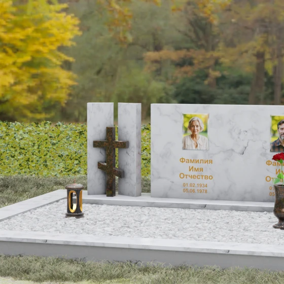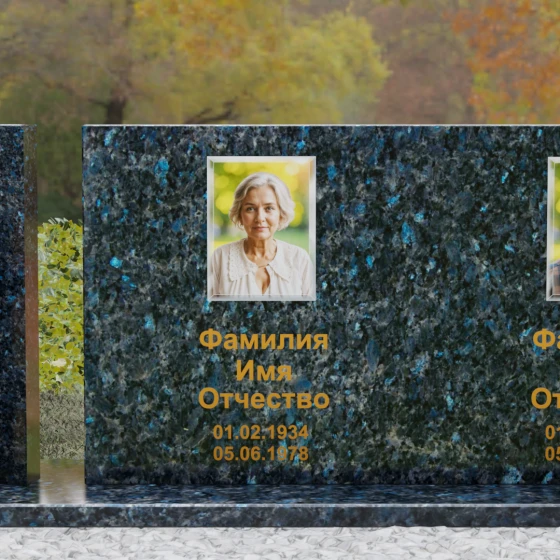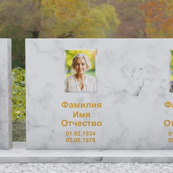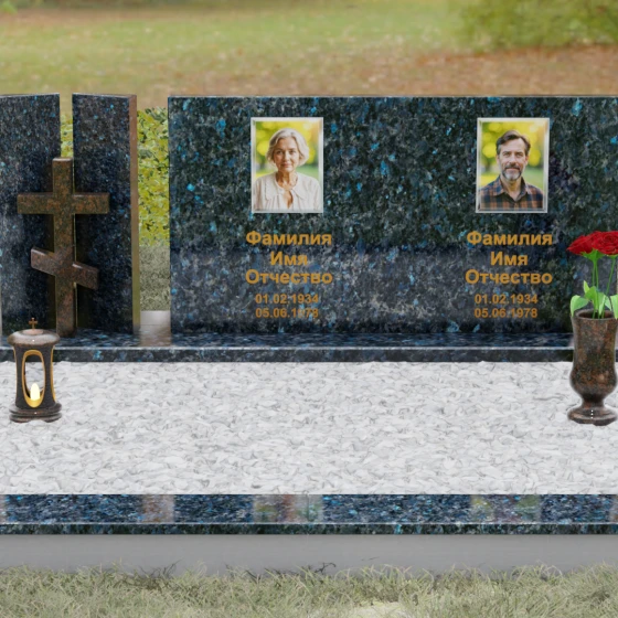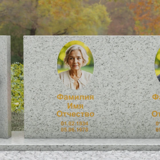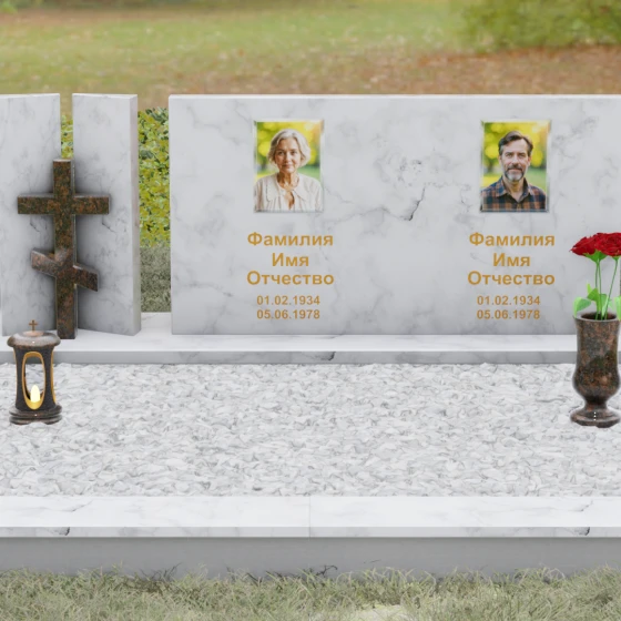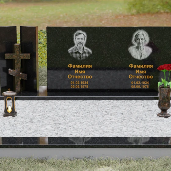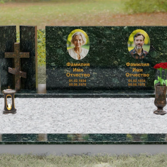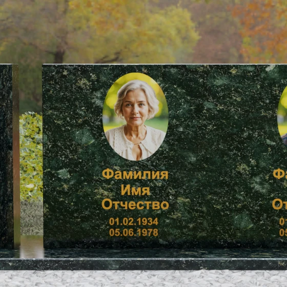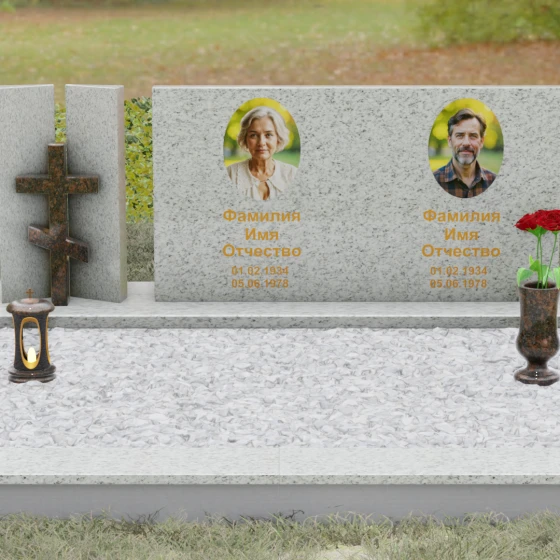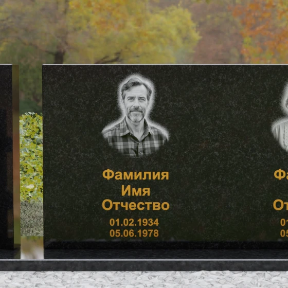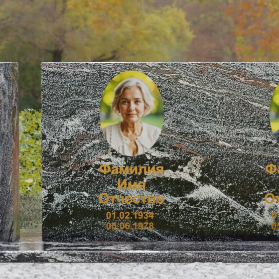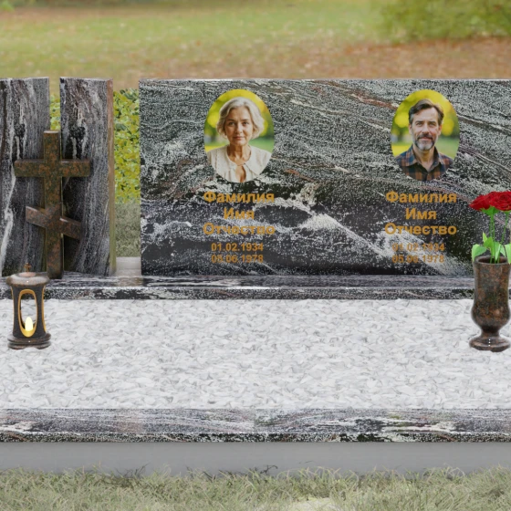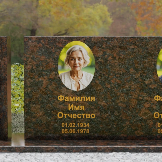 Оформление: Учитывая внушительную площадь горизонтальной поверхности, для этой формы идеально подходит классическая лазерная гравировка портретов. Если же вы выбрали цветной камень (например, Мансуровский гранит или мрамор Тассо), мы рекомендуем установку цветных фотокерамических портретов в овальных или прямоугольных нишах. ФИО и даты жизни лучше всего смотрятся в глубокой вырубке с последующим покрытием сусальным золотом или контрастной художественной краской — это обеспечит читаемость надписей даже с большого расстояния.