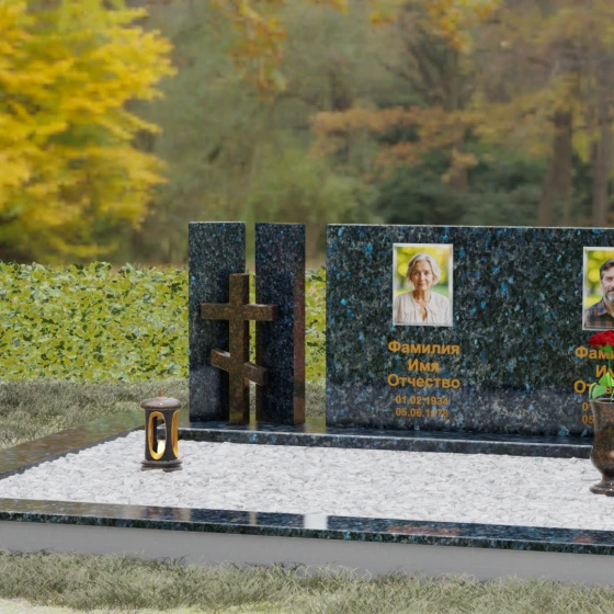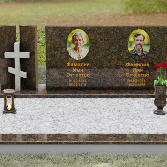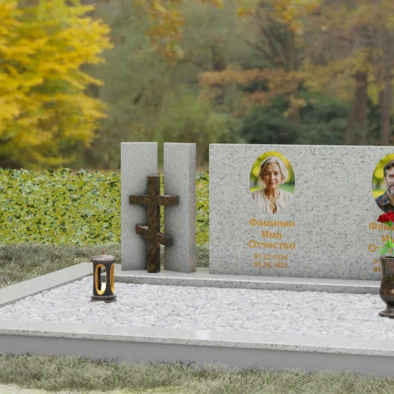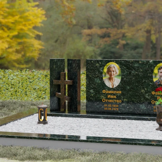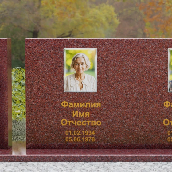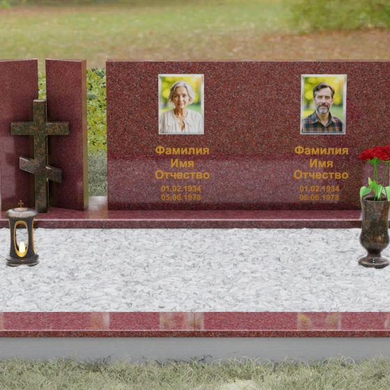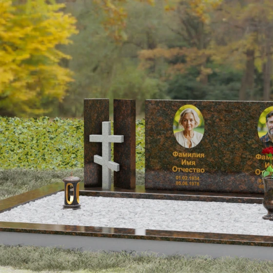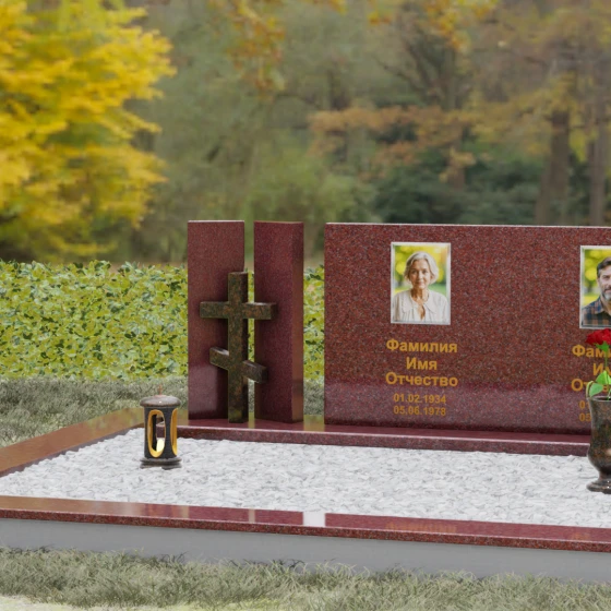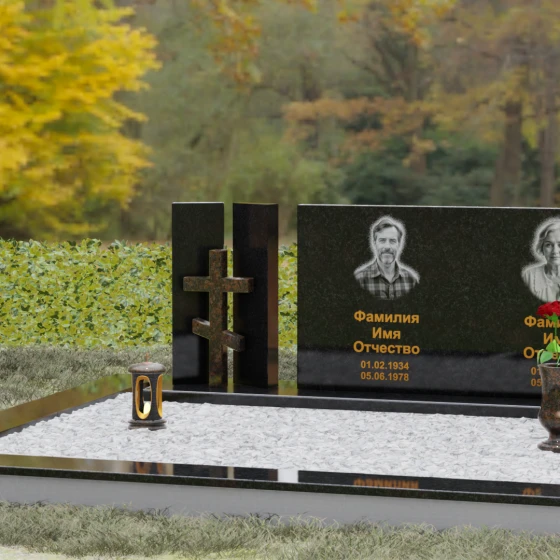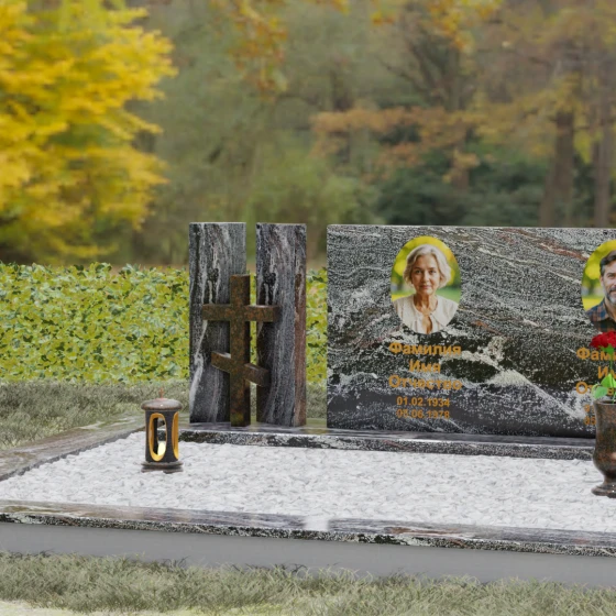 Этот гранитный монумент представляет собой сложную архитектурную композицию, в которой мастерство камнереза соединило строгую геометрию и глубокий религиозный символизм. Левая часть ансамбля решена в виде двух величественных вертикальных пилонов, между которыми, словно в священном портале, установлен рельефный восьмиконечный православный крест. Использование контрастного камня для креста — насыщенного красно-коричневого оттенка — создает мощный визуальный акцент, подчеркивая духовную значимость памятника. Основной смысловой центр композиции — массивная горизонтальная плита, чья безупречная зеркальная полировка отражает окружающий мир, превращая холодный камень в живое полотно для портретов дорогих людей.
