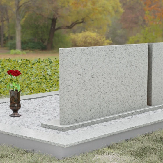Данная модель (Артикул 119) спроектирована специально для парных или семейных захоронений. Горизонтальная ориентация основного блока позволяет гармонично разместить два портрета, сохраняя достаточно пространства для эпитафий и дат. Особое внимание уделено фактуре: грани центрального элемента имеют сложную фаску, которая придает изделию объем и завершенность. Основание всей конструкции — массивный полированный постамент, обеспечивающий надежную устойчивость на десятилетия. Благоустройство участка дополняется декоративной засыпкой из светлого камня, что избавляет от необходимости борьбы с сорняками, и функциональными элементами: изящной гранитной вазой для живых цветов и закрытой лампадой, выполненной в едином стиле с основным ансамблем.