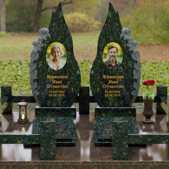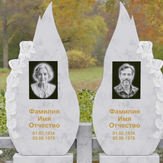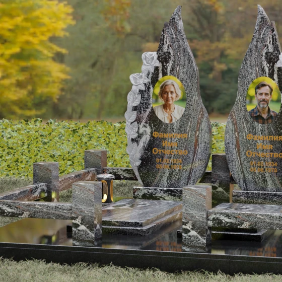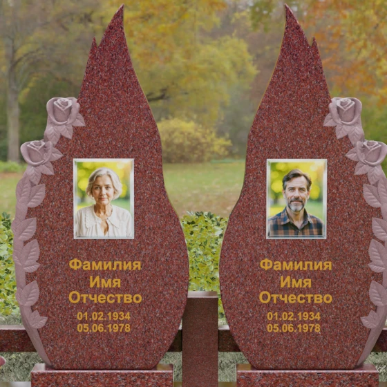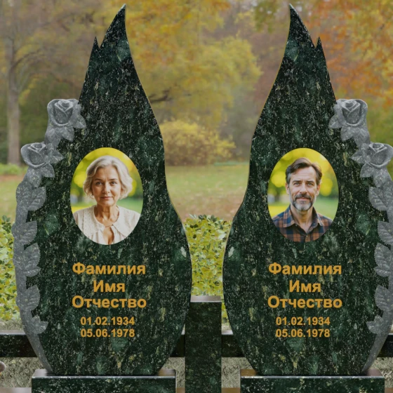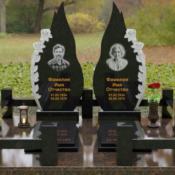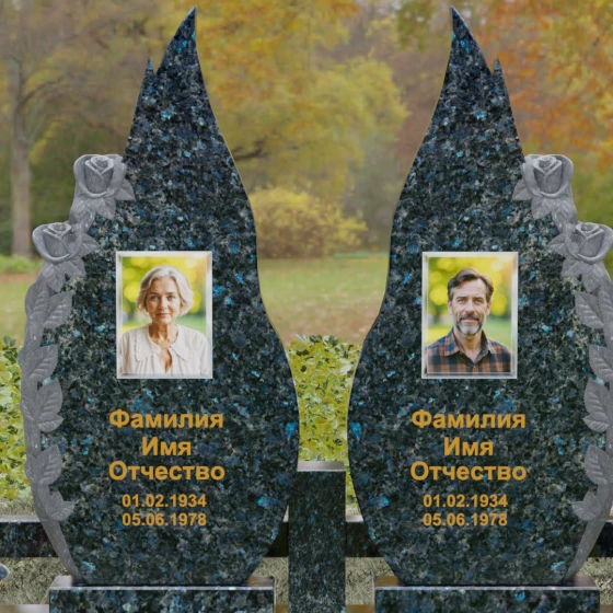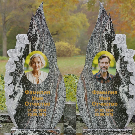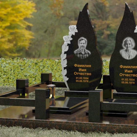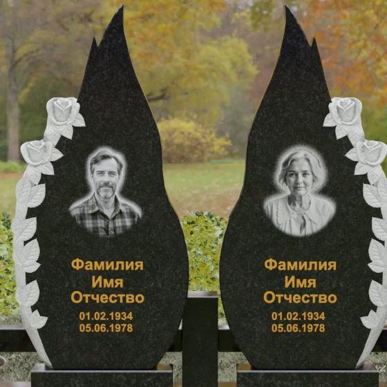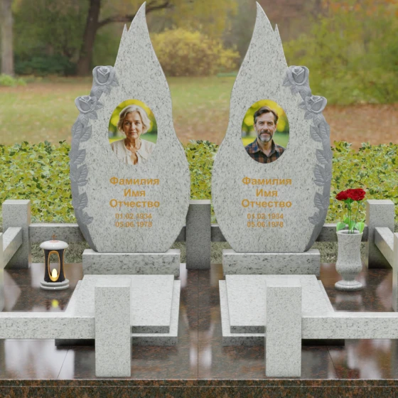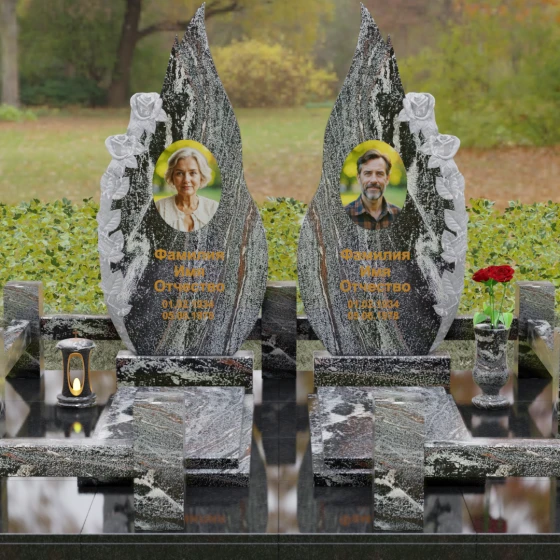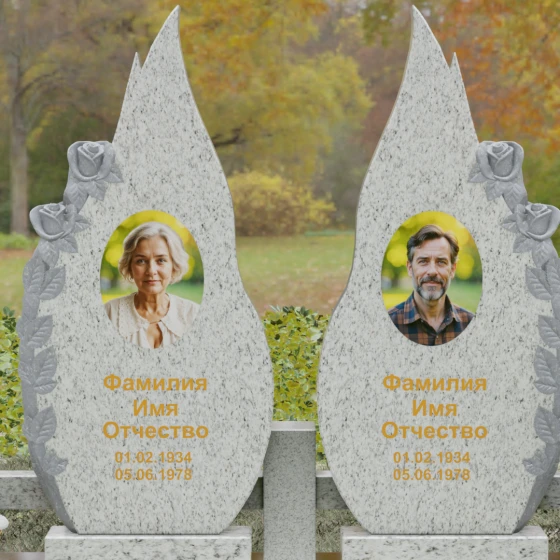 Представленный мемориальный ансамбль (Артикул 120) — это не просто место захоронения, а законченное художественное произведение, воспевающее торжество вечной любви и неразрывную связь душ. Композиция состоит из двух вертикальных стел, чья форма напоминает застывшие лепестки или два тянущихся к небу пламени свечи. Такое надгробие из натурального камня воплощает идею парного пути: плавные, текучие изгибы граней символизируют жизненные волны, которые сошлись в единой тихой гавани. Особое внимание привлекает филигранная ручная работа: по внешнему краю каждой стелы «расцветают» объемные розы. Резчик мастерски передал многослойность лепестков и изящество бутонов, создавая удивительный контраст между зеркально отполированной основной поверхностью и благородной матовой фактурой резного камня. Этот визуальный акцент придает монументу глубину, делая его облик одновременно величественным и трогательным.