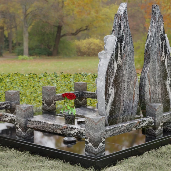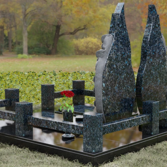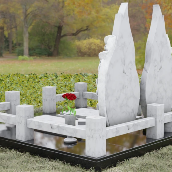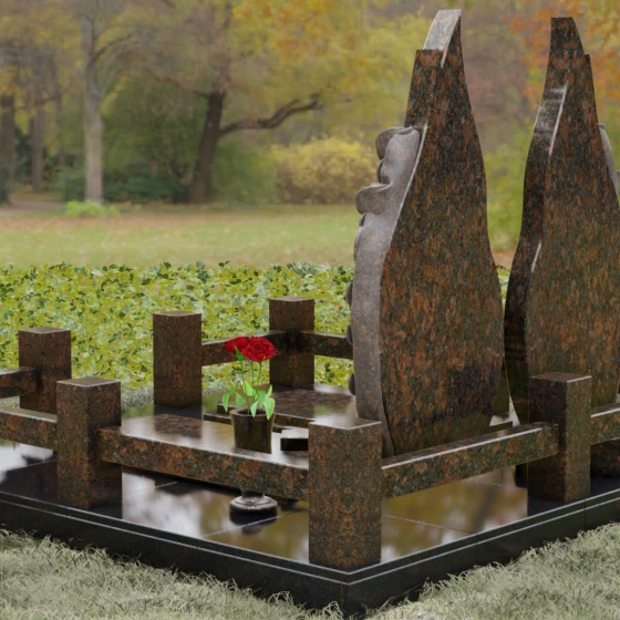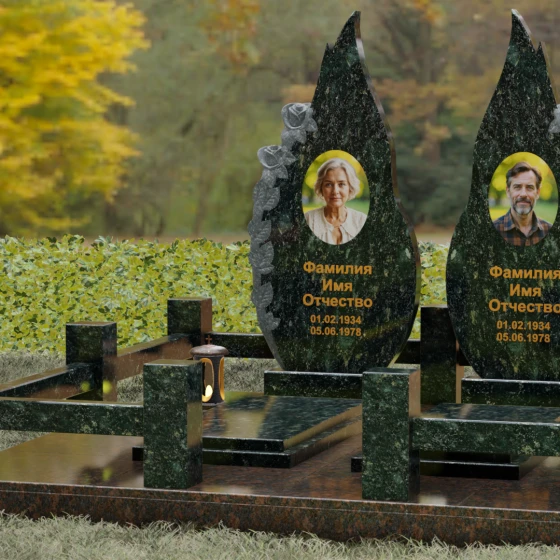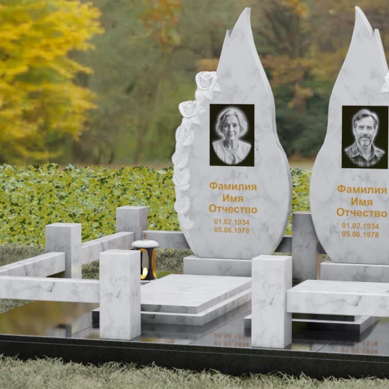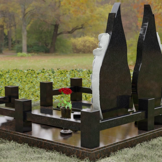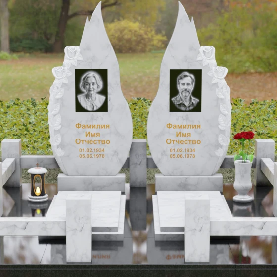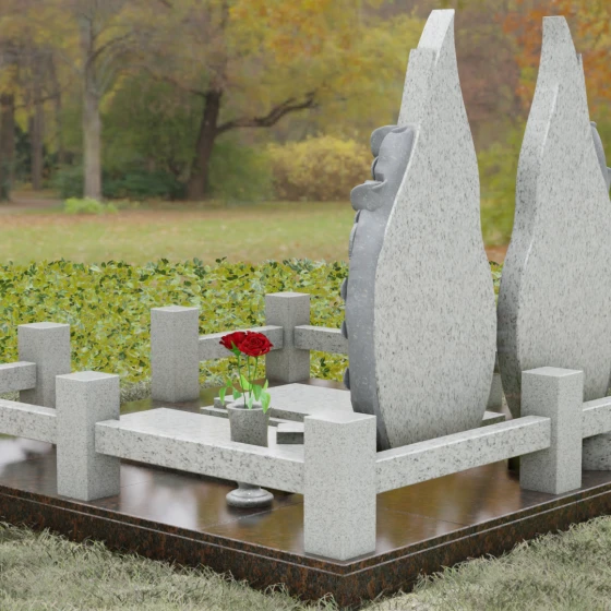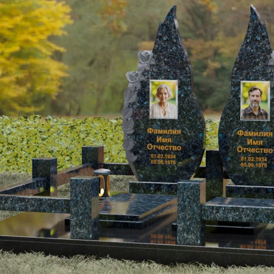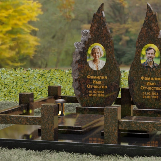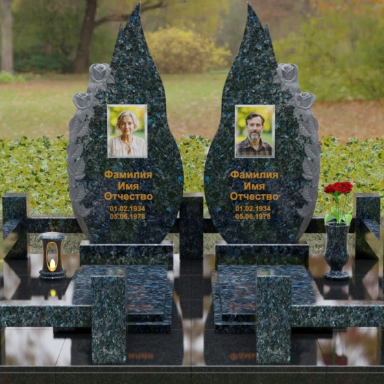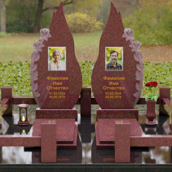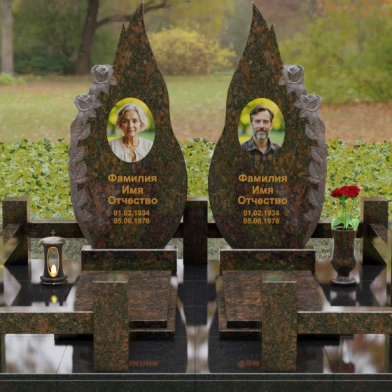 Представленный мемориальный ансамбль (Артикул 120) — это не просто место захоронения, а законченное художественное произведение, воспевающее торжество вечной любви и неразрывную связь душ. Композиция состоит из двух вертикальных стел, чья форма напоминает застывшие лепестки или два тянущихся к небу пламени свечи. Такое надгробие из натурального камня воплощает идею парного пути: плавные, текучие изгибы граней символизируют жизненные волны, которые сошлись в единой тихой гавани. Особое внимание привлекает филигранная ручная работа: по внешнему краю каждой стелы «расцветают» объемные розы. Резчик мастерски передал многослойность лепестков и изящество бутонов, создавая удивительный контраст между зеркально отполированной основной поверхностью и благородной матовой фактурой резного камня. Этот визуальный акцент придает монументу глубину, делая его облик одновременно величественным и трогательным.