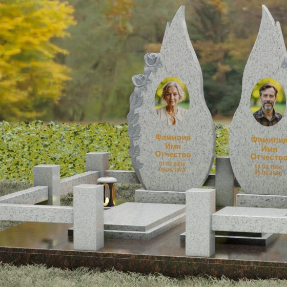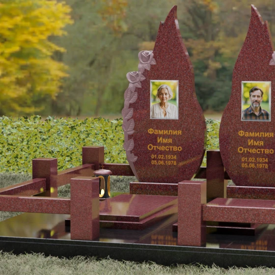 Оформление: Данная форма стел идеально подходит для гравировки классических портретов или установки фотокерамики в овальных нишах. За счет вертикальной ориентации и «пламени» в верхней части, надписи рекомендуется располагать по центру или с небольшим смещением, используя сусальное золото или глубокую гравировку с покраской «под золото» — это создаст великолепный контраст с темными видами гранита. Между именами можно разместить небольшую эпитафию, которая объединит две половины мемориала в общую историю.