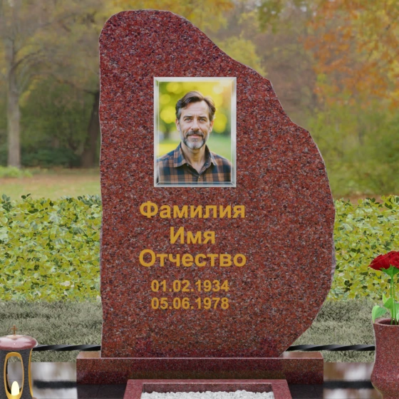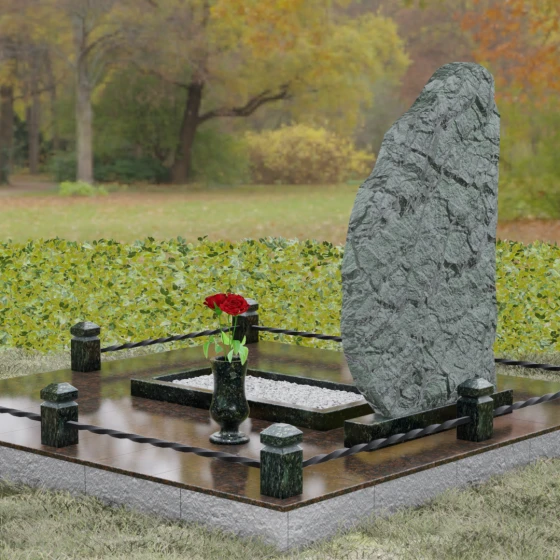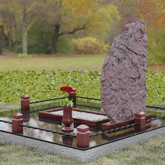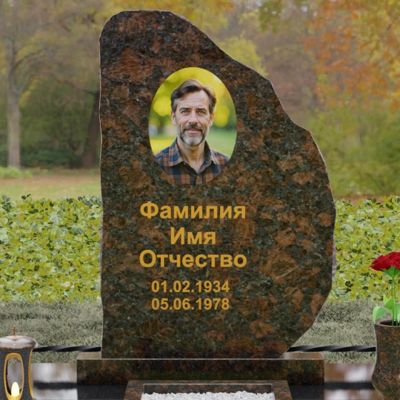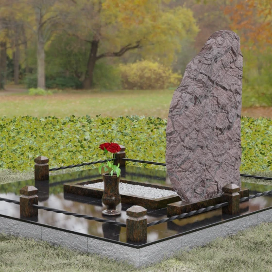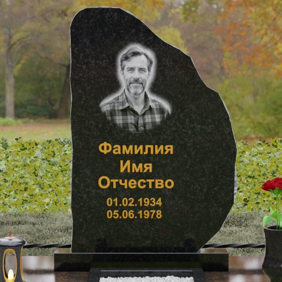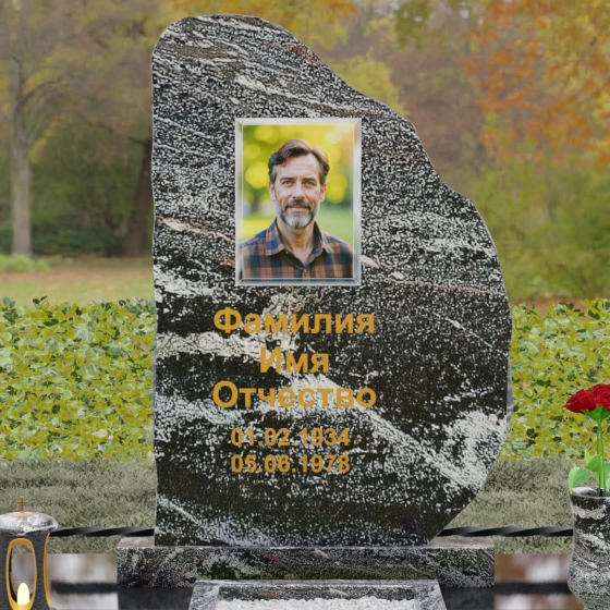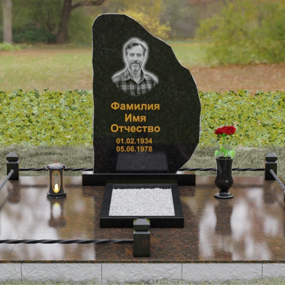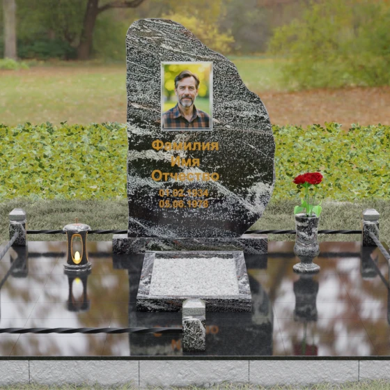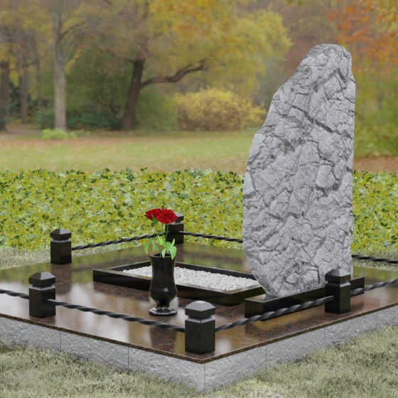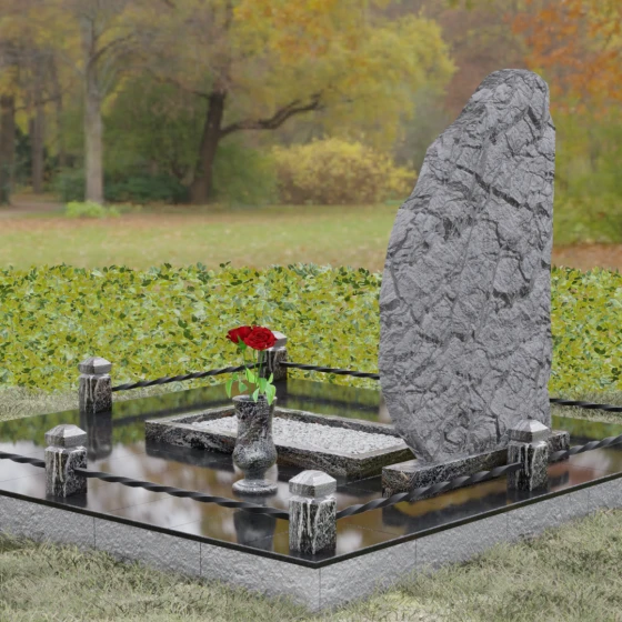 Данная модель мемориала представляет собой торжество асимметрии и гармонии. Основная стела выполнена в уникальной манере: её левая грань имеет строгий вертикальный срез, подчеркивающий монументальность, в то время как верхний и правый контуры обработаны в стиле «Скала». Этот необработанный, рельефный край создает великолепный контраст с зеркально отполированной лицевой поверхностью. Мастерски выполненная полировка позволяет камню буквально «играть» на солнце: свет отражается от гладкой плоскости и преломляется в грубых сколах рваного края, создавая неповторимый эффект объема и глубины.