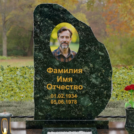 Широкие фаски по периметру полированной части придают памятнику законченный, аккуратный вид, смягчая переход от строгой геометрии к природному хаосу. Текст и портрет, нанесенные на стелу, обрамлены этой живой текстурой камня, что делает композицию целостной и выразительной. Каждый элемент резьбы направлен на то, чтобы подчеркнуть природную красоту материала и величие момента.