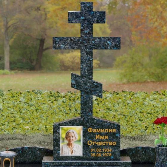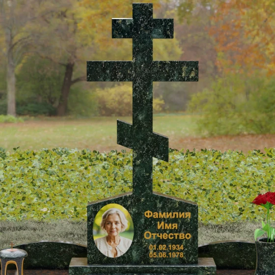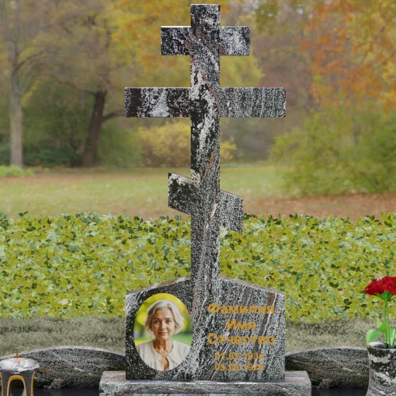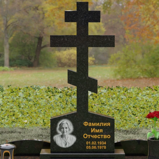 Центральной доминантой композиции выступает величественный православный крест, интегрированный в широкое основание стелы. Это не просто плоский силуэт, а сложная объемная структура с акцентированными гранями. Мастерская обработка камня позволяет добиться потрясающей игры света и тени на полированных поверхностях: зеркальный блеск фронтальных плоскостей контрастирует с четкими линиями фасок, создавая эффект глубины и монументальности. Нижняя часть стелы имеет изящное навершие в форме пологой арки, что смягчает строгость вертикальных линий и придает конструкции архитектурную завершенность. Портрет и надписи, нанесенные на основное полотно, выглядят органично, а использование золоченой гравировки подчеркивает статусность мемориала.